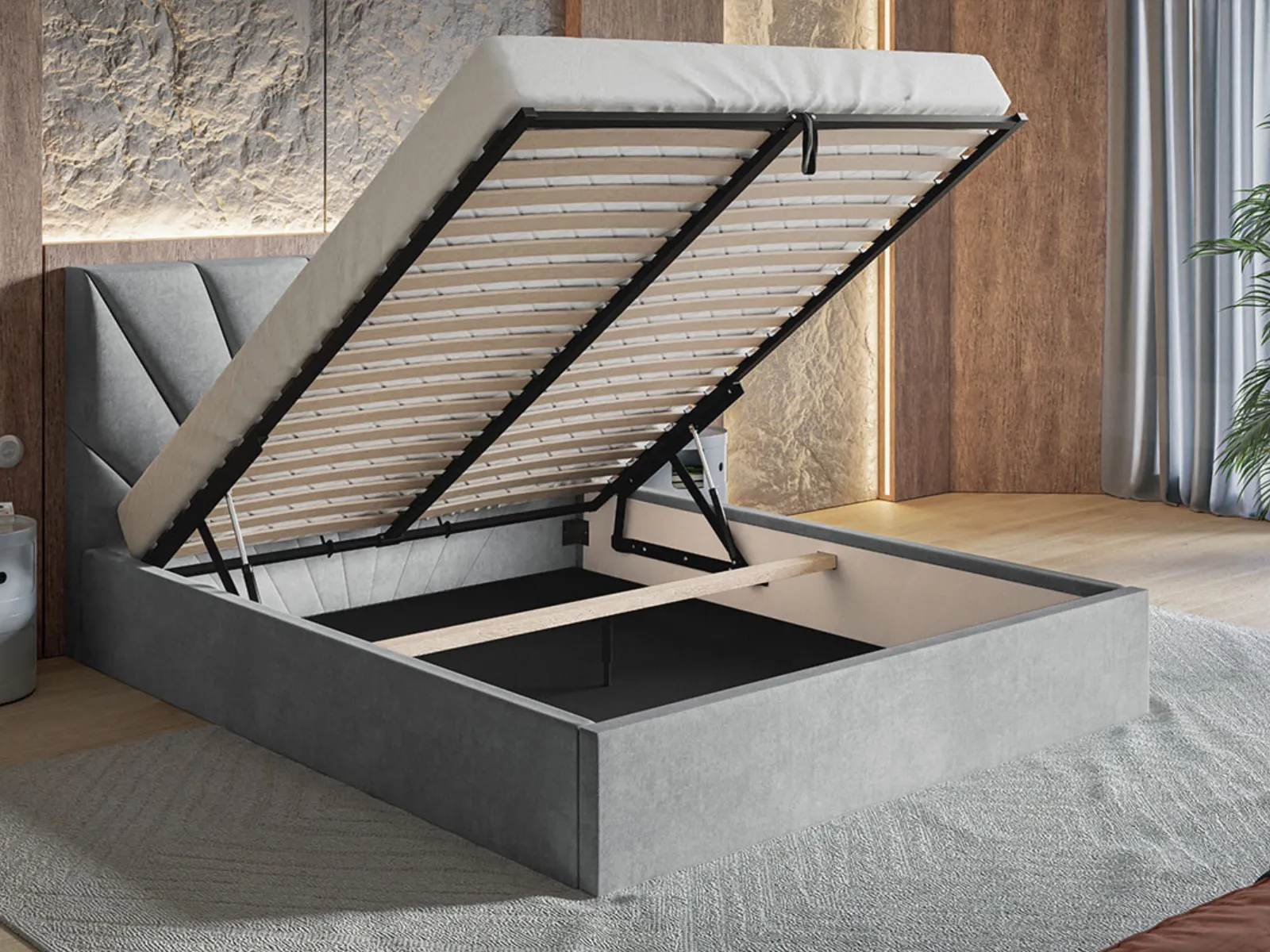 Łóżko tapicerowane 140x200 REGALIA SLIM z pojemnikiem i stelażem szary welur