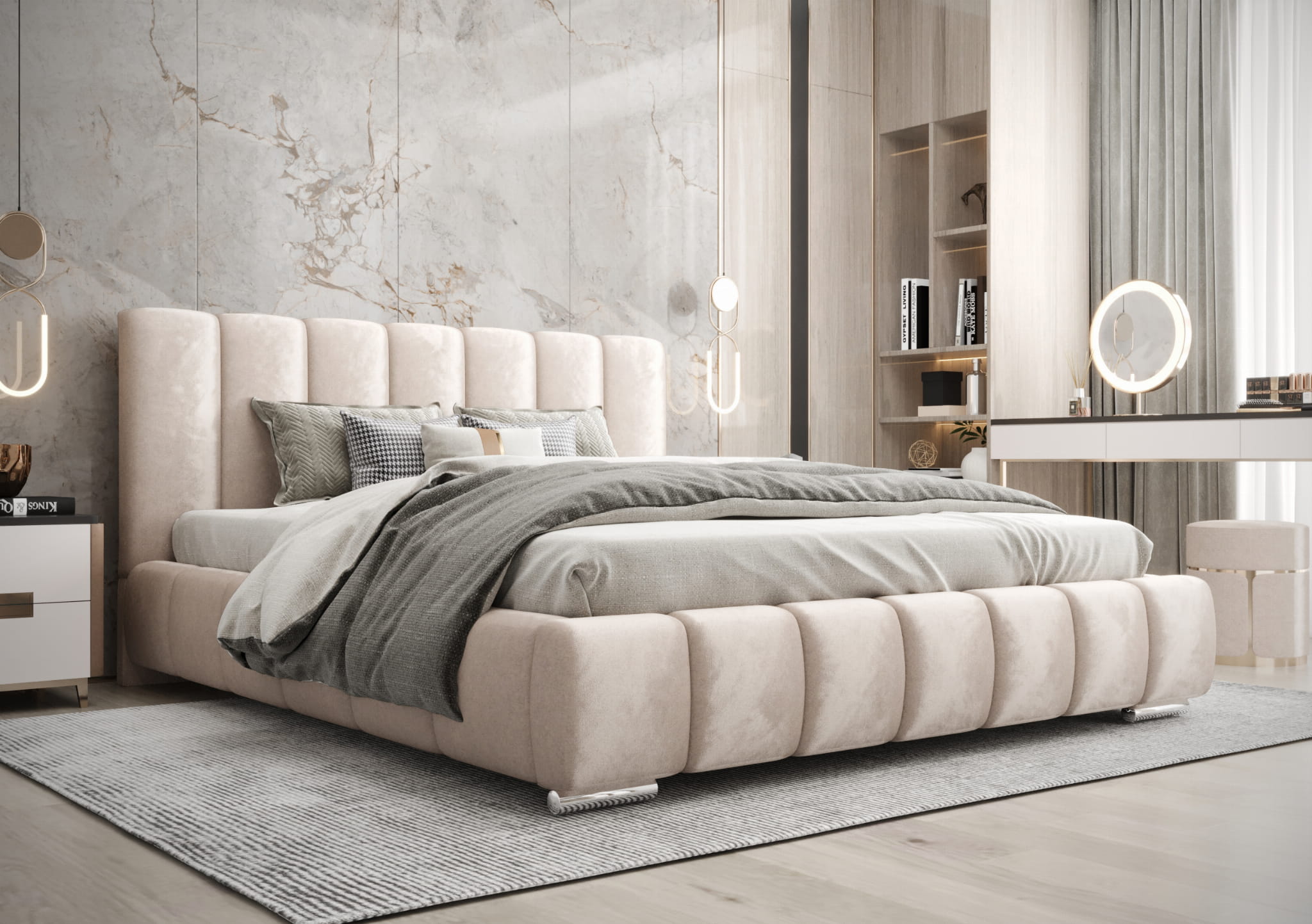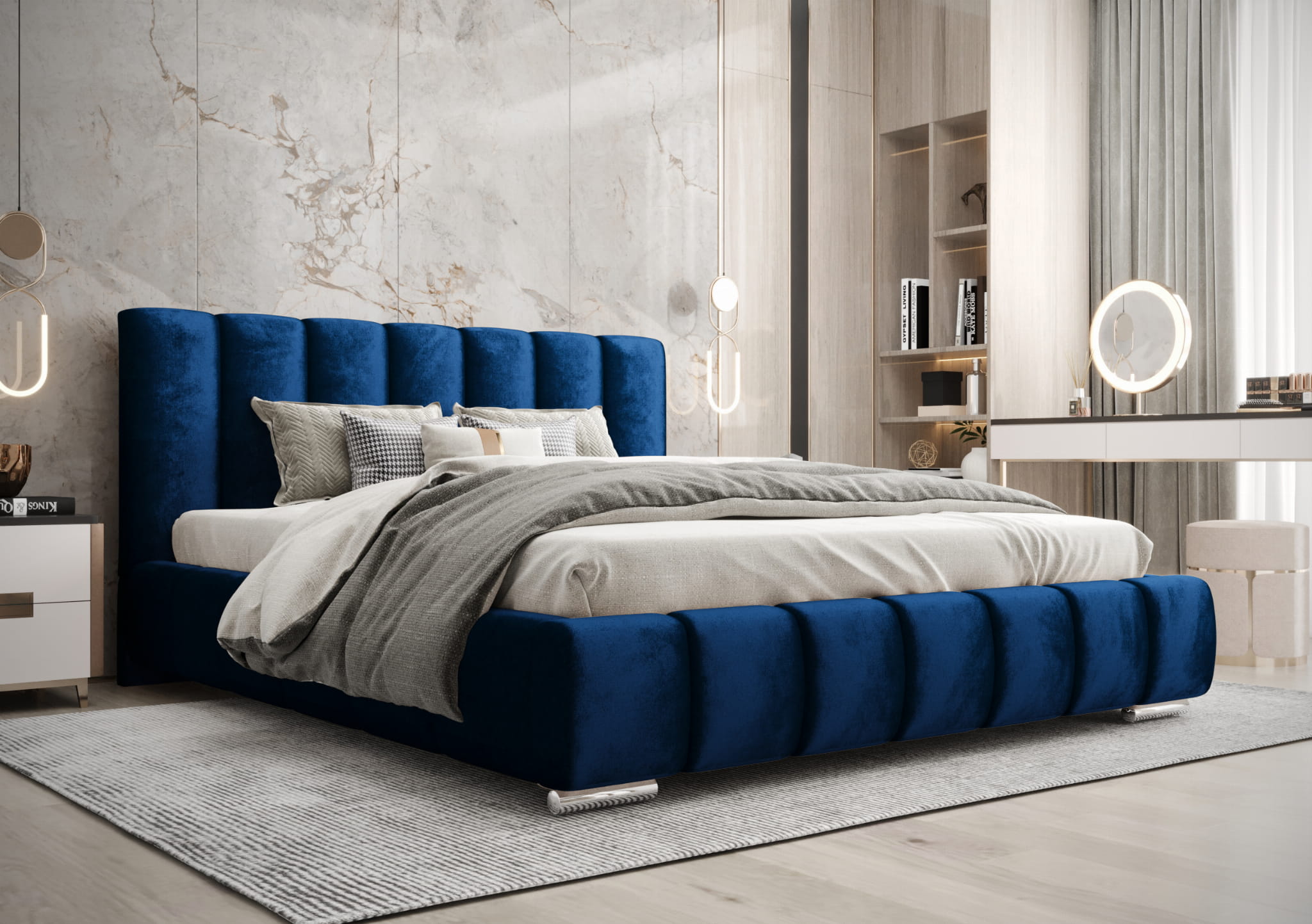 Łóżko tapicerowane Rubel to idealne połączenie elegancji i funkcjonalności. Jego nowoczesny design sprawia, że doskonale wpisuje się w każde wnętrze, dodając mu szyku i stylu. Wyposażone w praktyczny pojemnik na pościel, zapewnia wygodne przechowywanie kołder, poduszek i innych tekstyliów, pomagając utrzymać porządek w sypialni. Solidny stelaż gwarantuje stabilność oraz komfortowy sen przez wiele lat.
