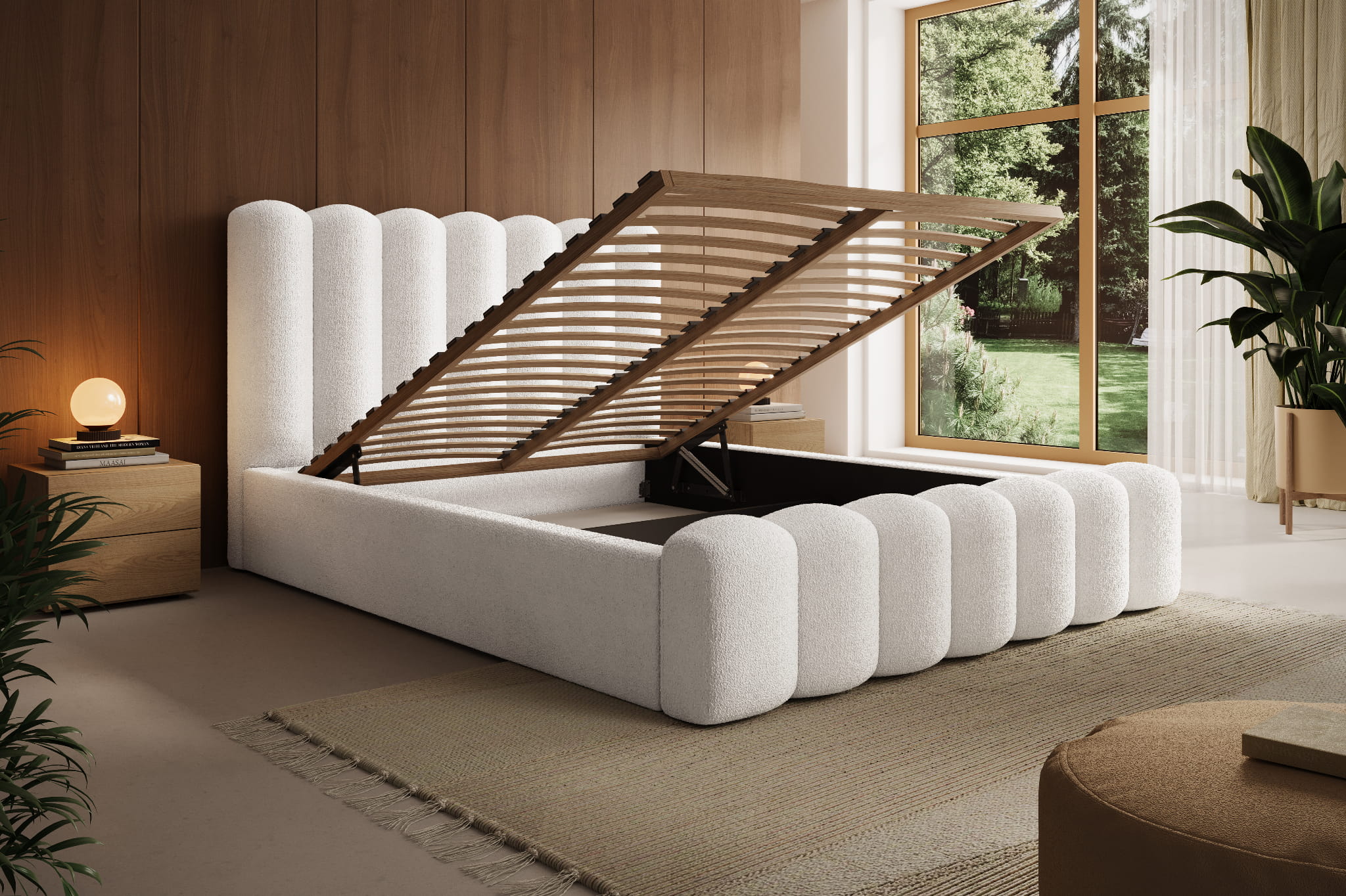 Łóżko tapicerowane 160x200 AIDEN LUX z pojemnikiem i stelażem białe boucle