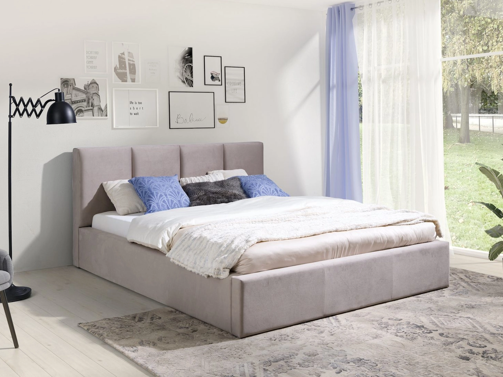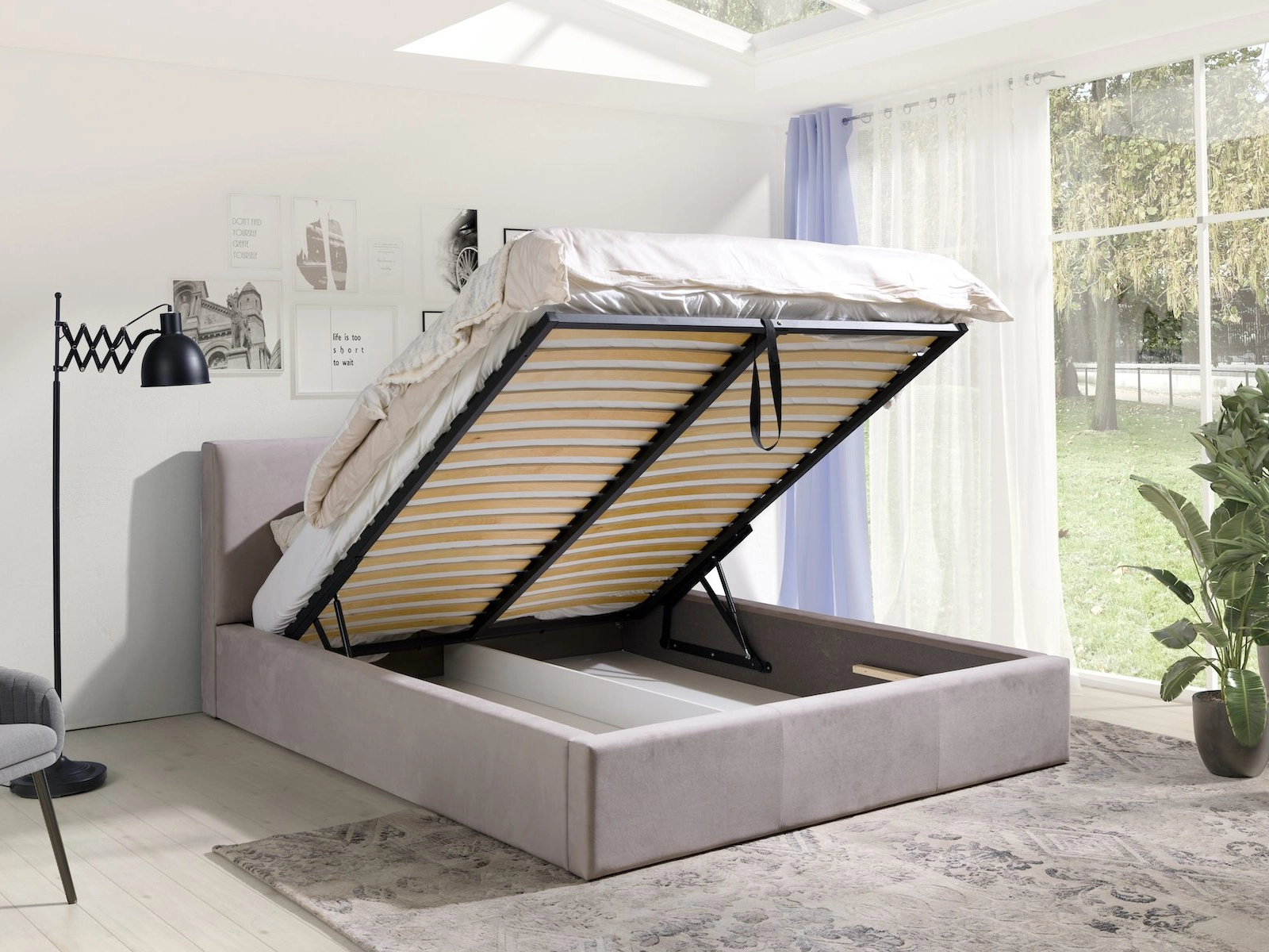 Łóżko tapicerowane 160x200 ALBA beżowe z pojemnikiem i metalowym stelażem