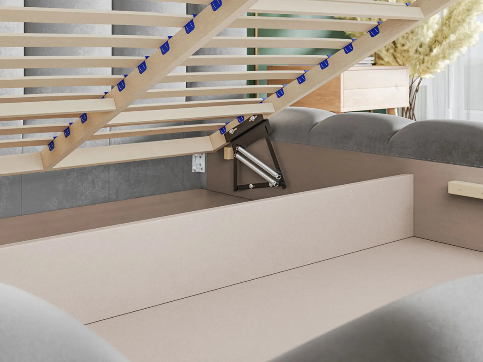 Łóżko tapicerowane 160x200 ARDEN szare z pojemnikiem na pościel i stelażem