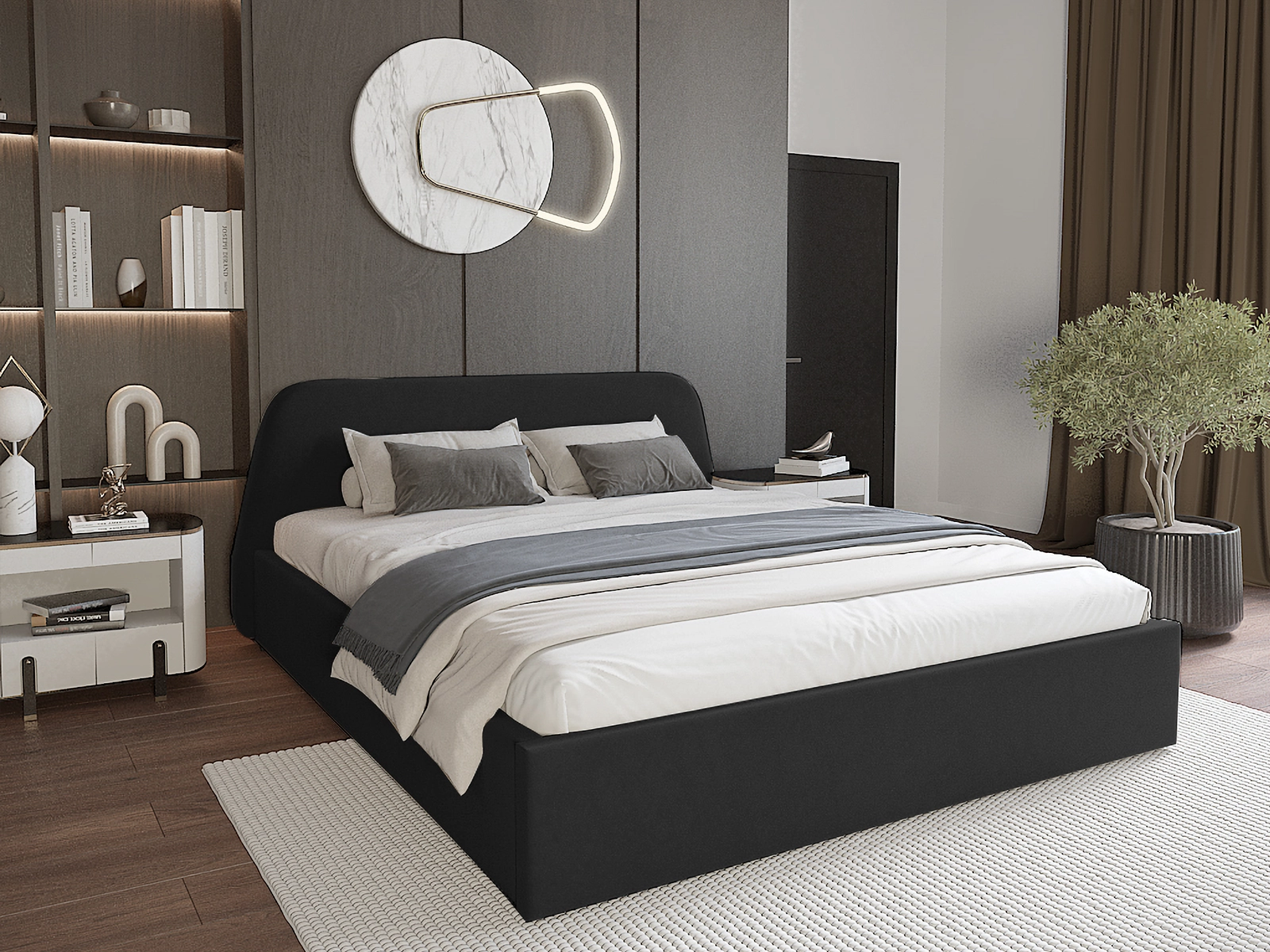 Łóżko Bruno wyróżnia się eleganckim, opływowym zagłówkiem, który dodaje wnętrzu wyjątkowego charakteru i zapewnia wygodne podparcie podczas wieczornego relaksu. Miękka tapicerka sprawia, że łóżko prezentuje się niezwykle luksusowo i przytulnie, tworząc idealne miejsce do odpoczynku.