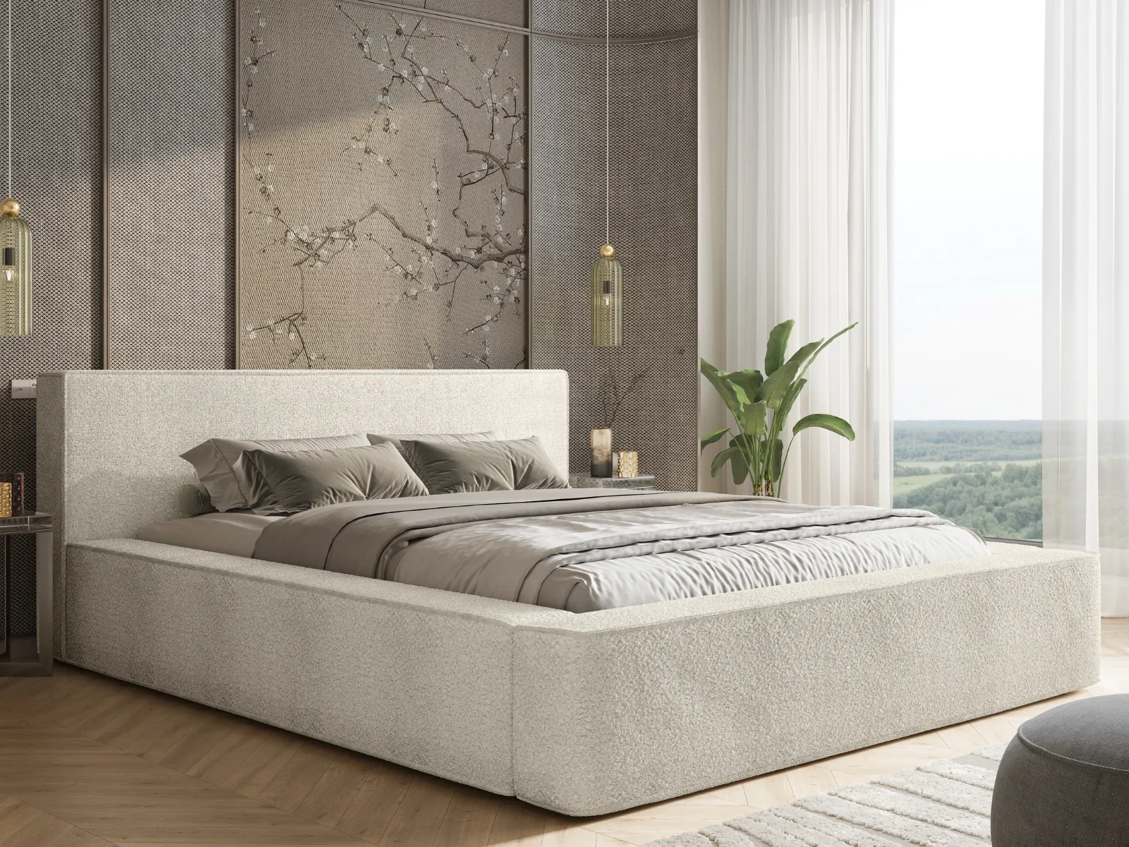 To wyjątkowy model, który zachwyca masywną konstrukcją, geometrycznym wykończeniem i miękkim obiciem w tkaninie boucle Quelle. Idealnie sprawdzi się w sypialniach, gdzie liczy się styl, wygoda i trwałość.