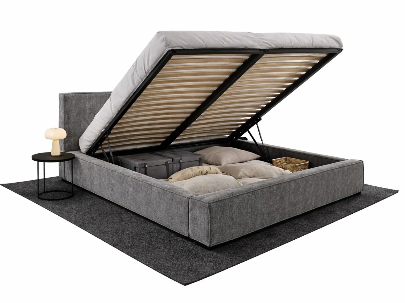 Elira to praktyczne łóżko tapicerowane z pojemnikiem na pościel, który znajduje się pod całą powierzchnią spania. Idealne do przechowywania: