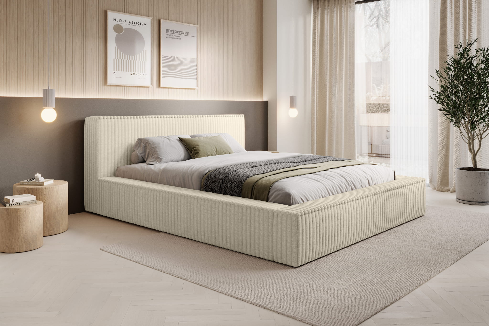 Łóżko tapicerowane 160x200 EMMA LUX z pojemnikiem i stelażem, jasnobeżowy sztruks