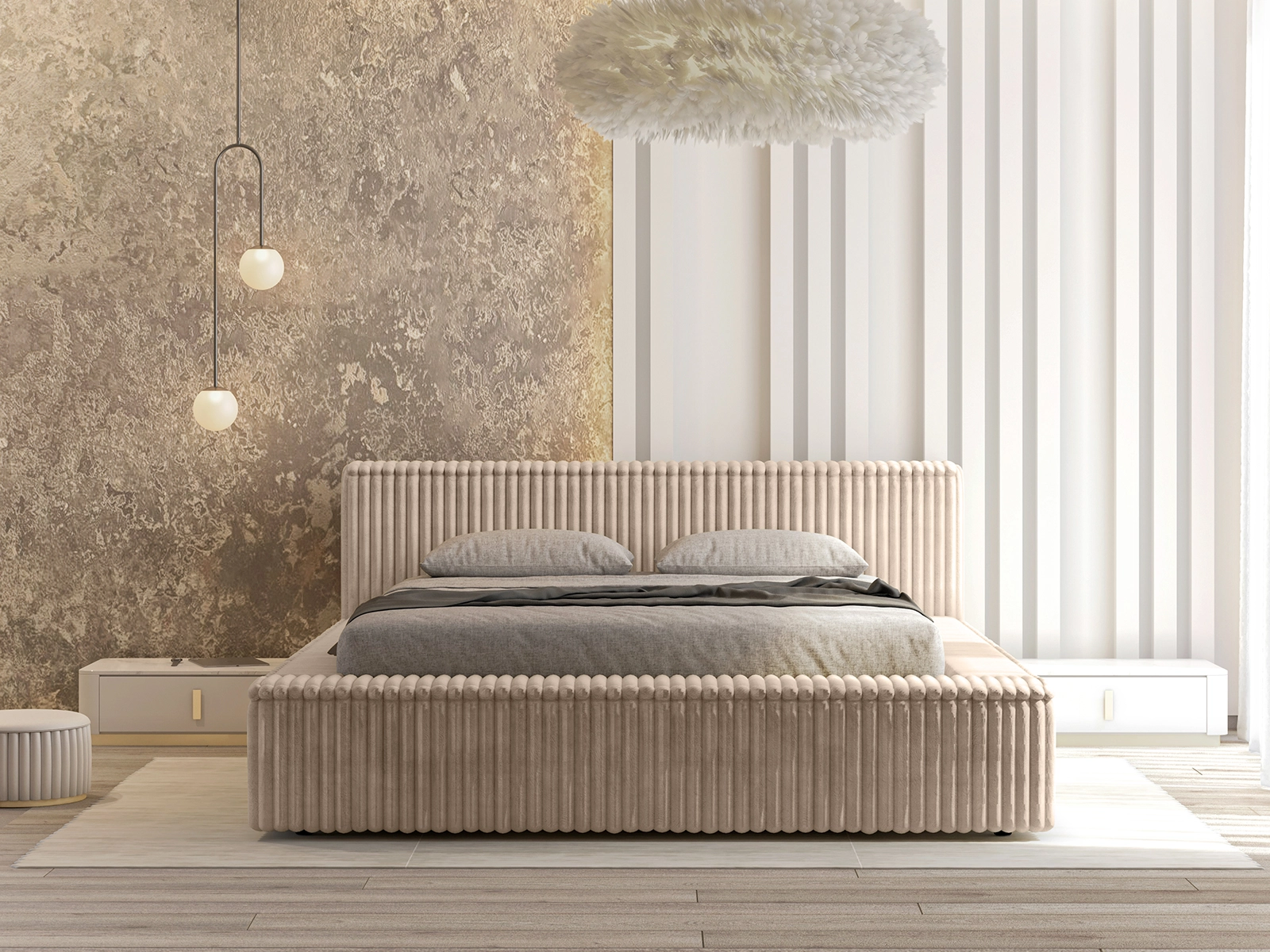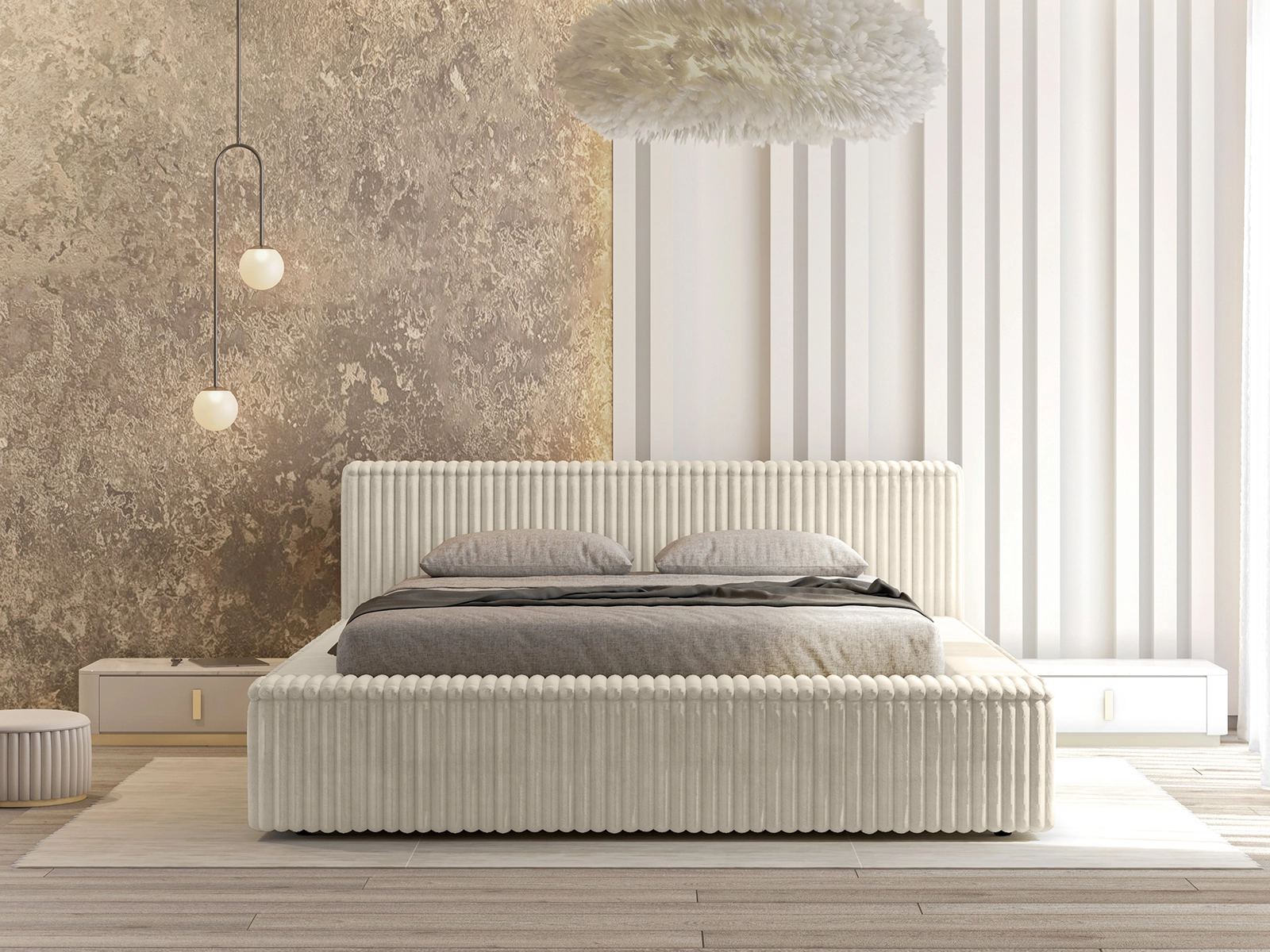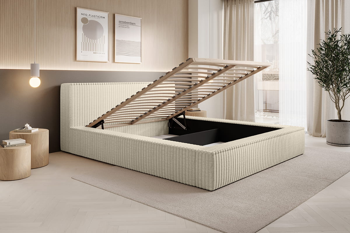 Łóżko tapicerowane 160x200 EMMA LUX z pojemnikiem i stelażem jasnobeżowy sztruks