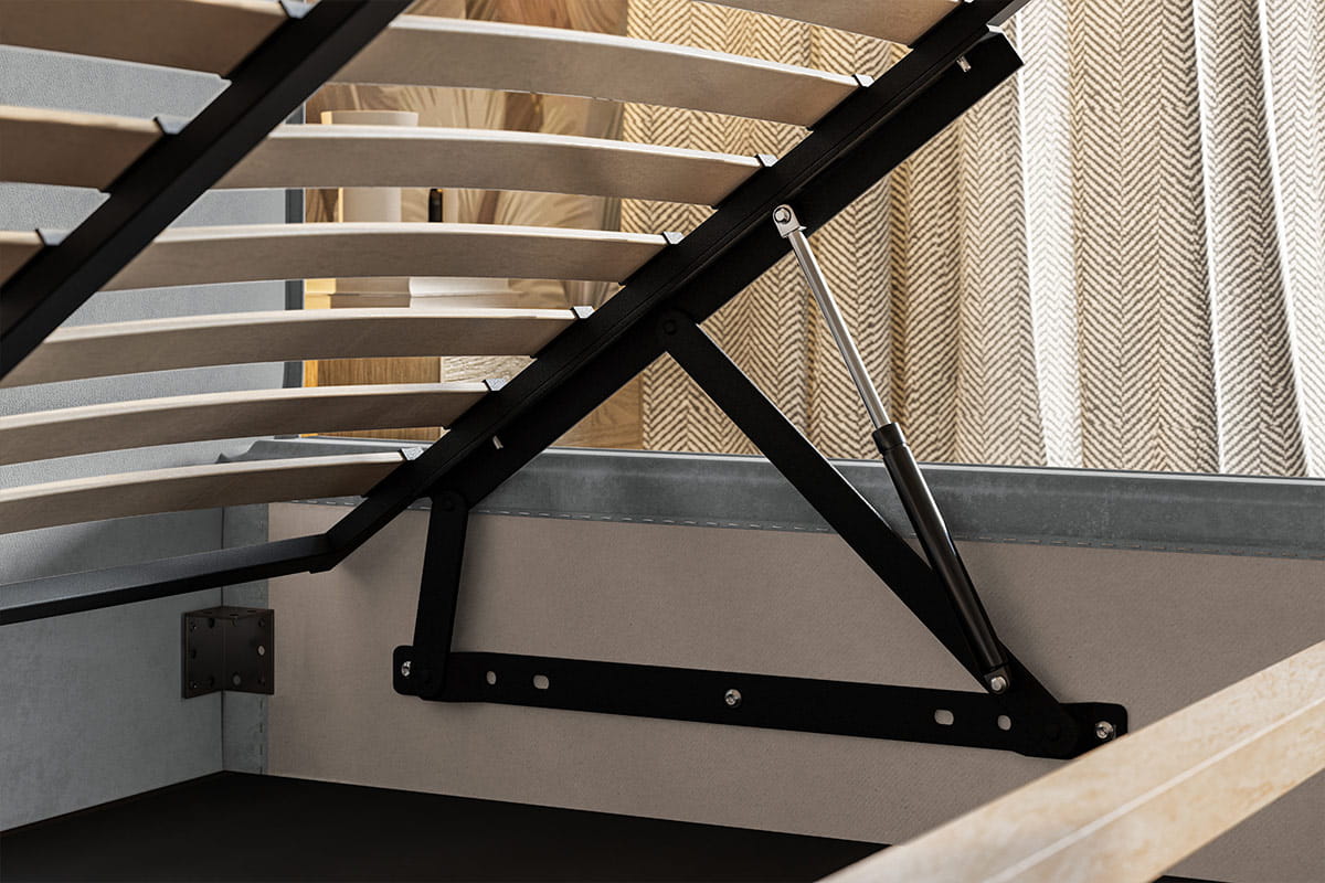Łóżko Flano Slim wyposażone jest w praktyczny pojemnik na pościel, który pozwala na optymalne wykorzystanie przestrzeni i utrzymanie porządku. Innowacyjne, materiałowe dno pojemnika zapewnia wygodne przechowywanie kołder, poduszek i innych tekstyliów. Stabilny stelaż dba o trwałość i wytrzymałość łóżka, gwarantując komfortowy sen na długie lata.