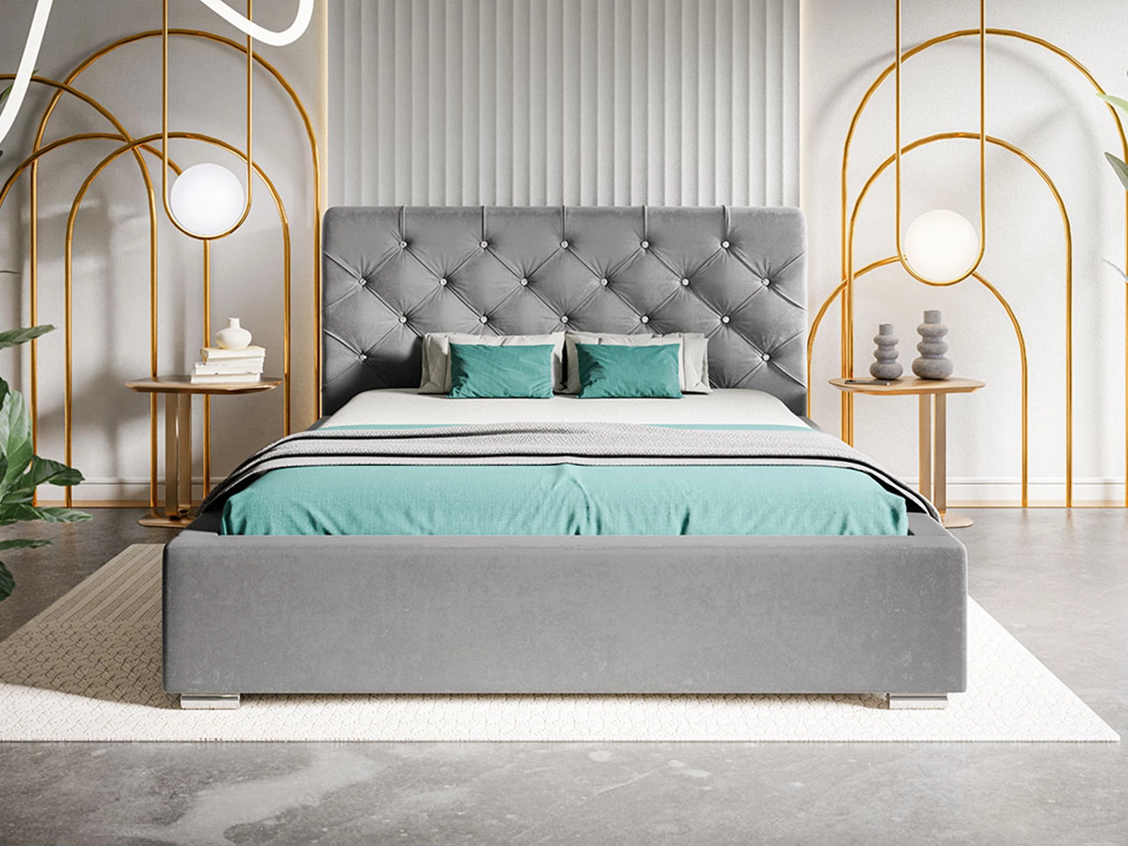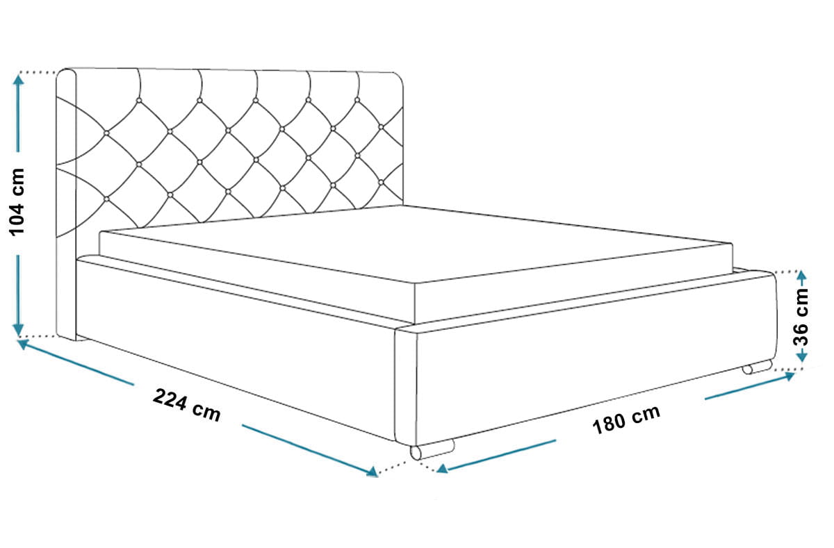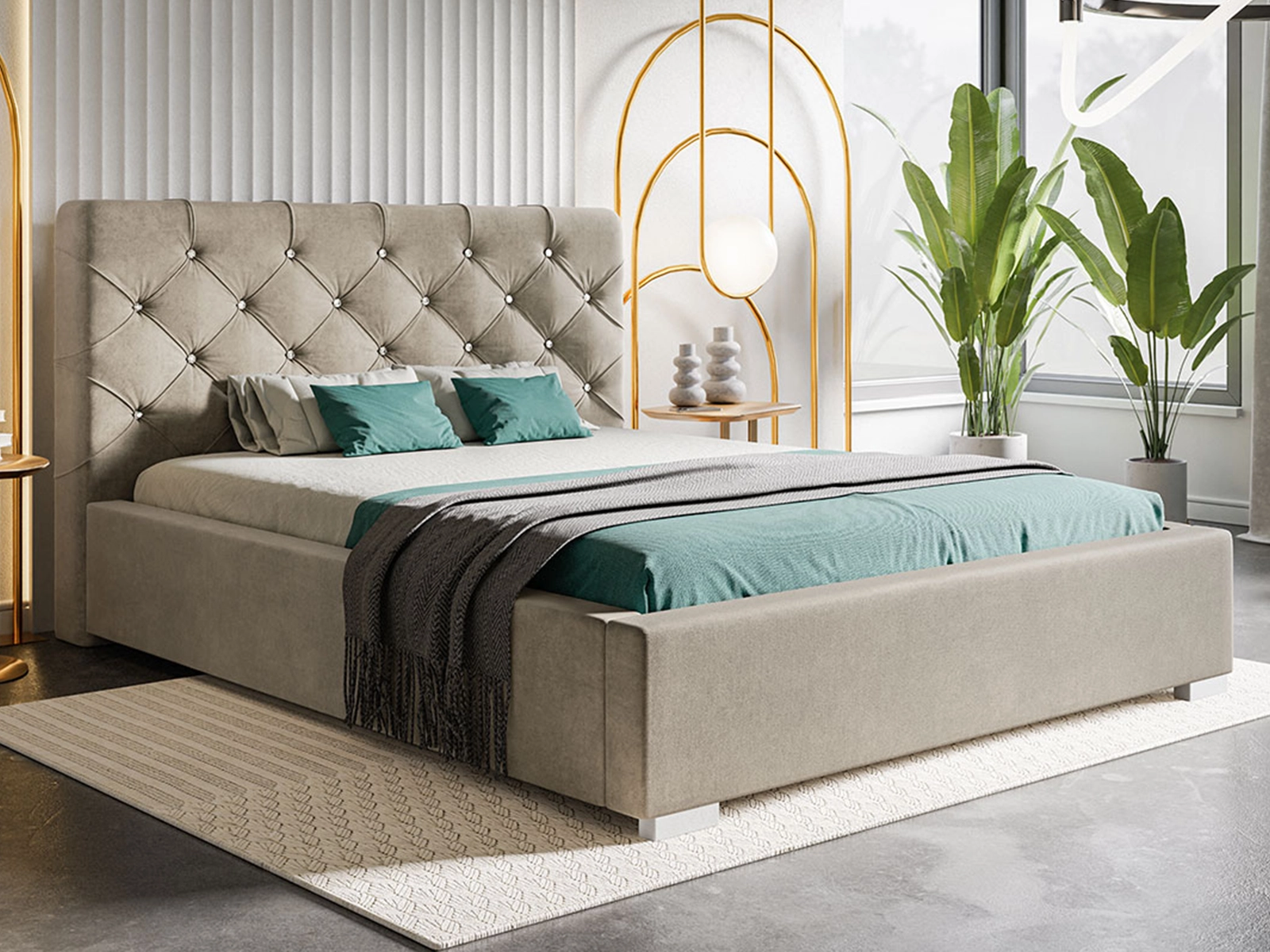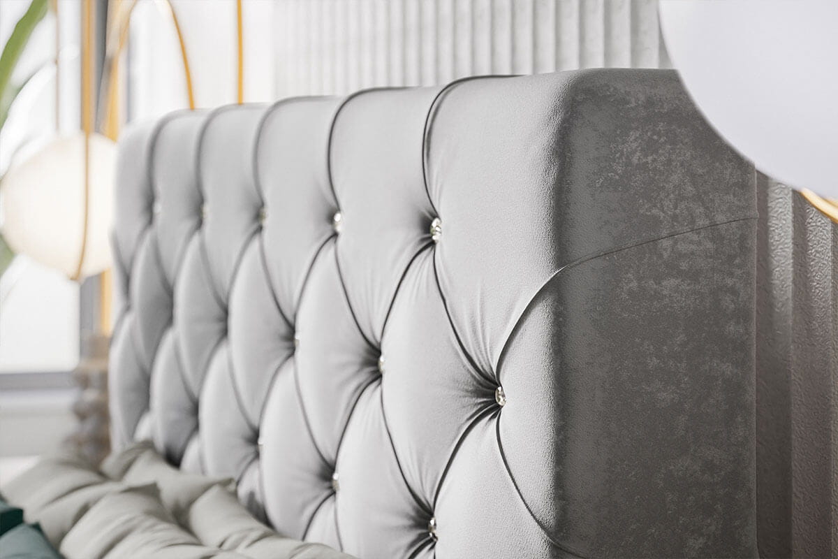 Głównym atutem tego łóżka jest ozdobny zagłówek z misternie wykonanymi pikowaniami, które są dodatkowo ozdobione połyskującymi cyrkoniami. Te detale dodają wnętrzu wyjątkowego blasku i wyrafinowanego stylu. Tapicerka, wykonana z miękkiego i trwałego materiału, zapewnia nie tylko wyjątkowy komfort, ale także długotrwałą estetykę, idealnie dopasowując się do luksusowego charakteru sypialni.