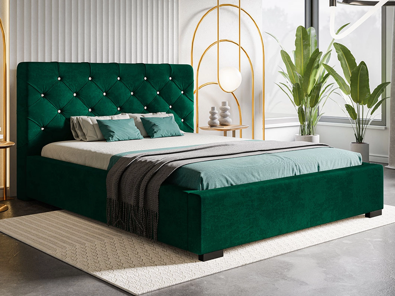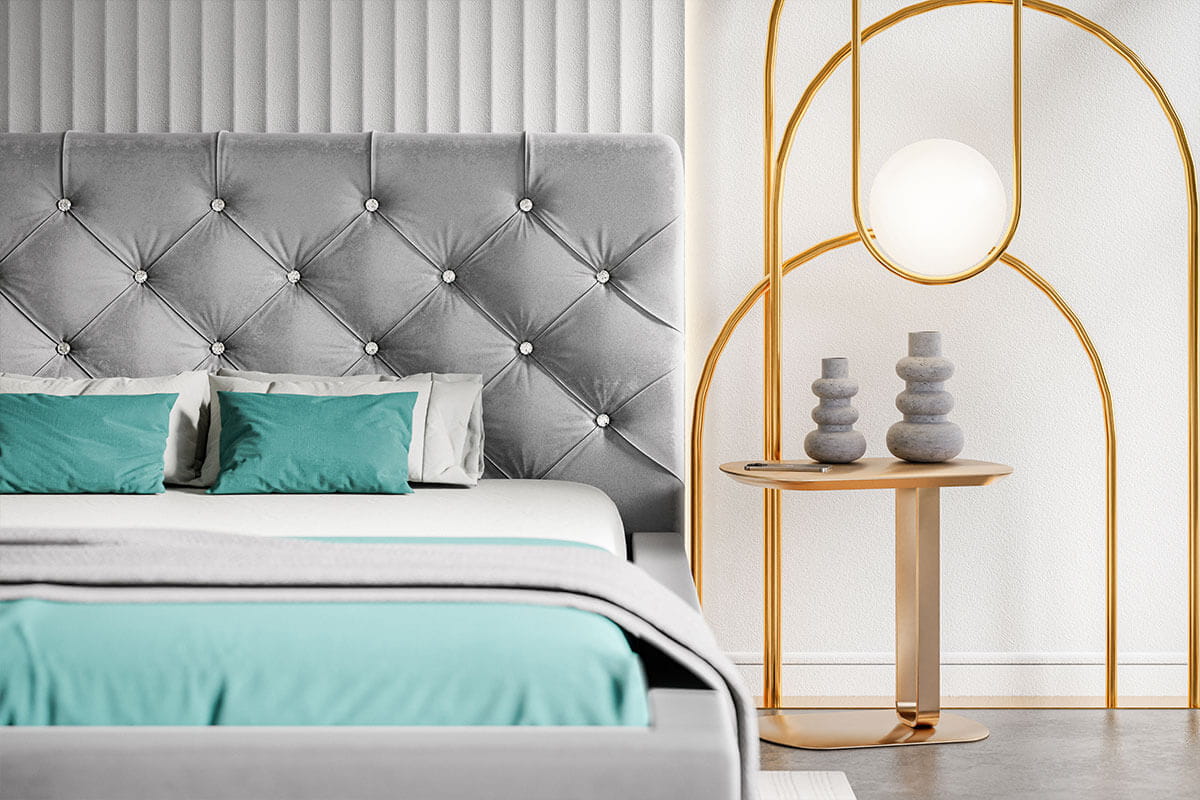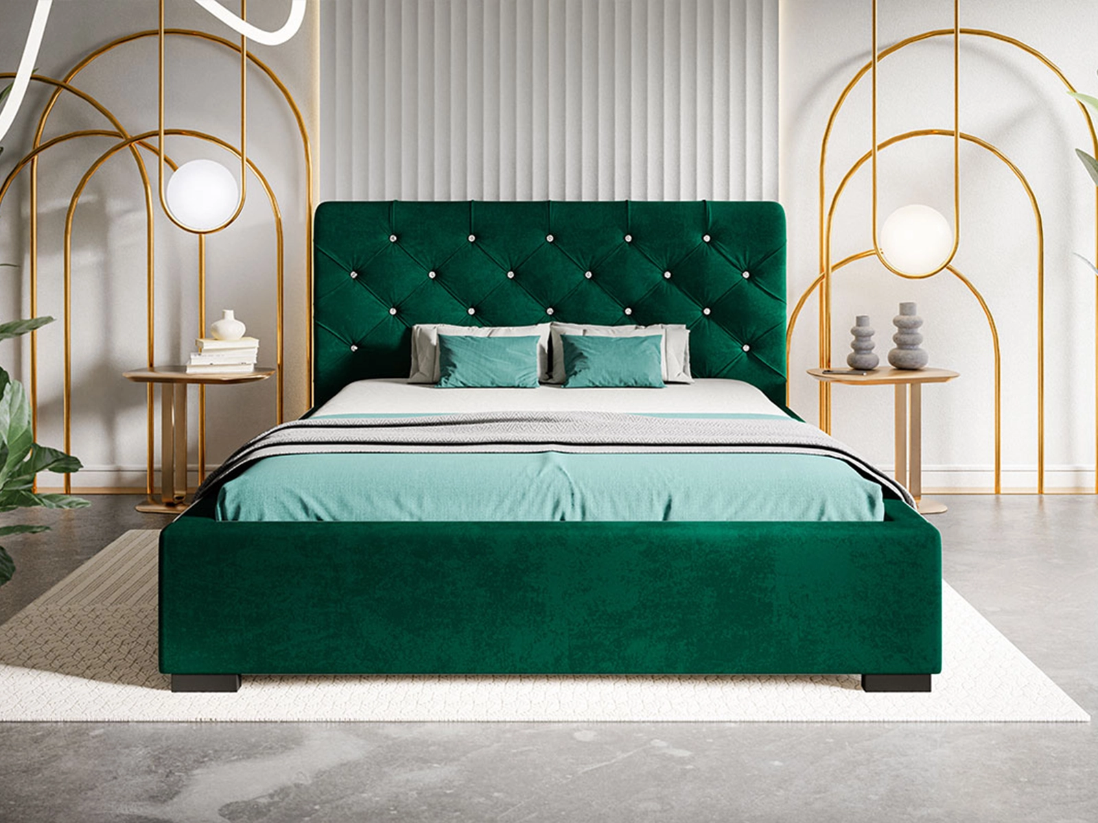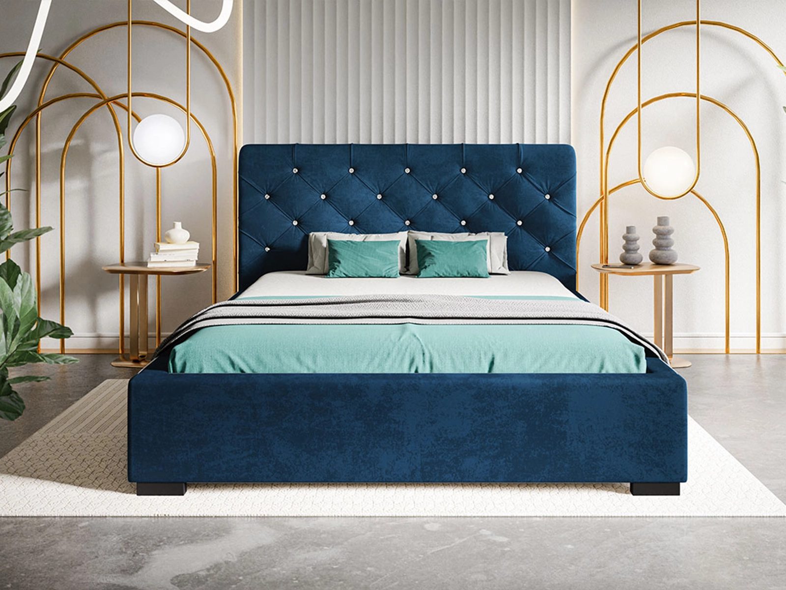 Głównym atutem tego łóżka jest ozdobny zagłówek z misternie wykonanymi pikowaniami, które są dodatkowo ozdobione połyskującymi cyrkoniami. Te detale dodają wnętrzu wyjątkowego blasku i wyrafinowanego stylu. Tapicerka, wykonana z miękkiego i trwałego materiału, zapewnia nie tylko wyjątkowy komfort, ale także długotrwałą estetykę, idealnie dopasowując się do luksusowego charakteru sypialni.
