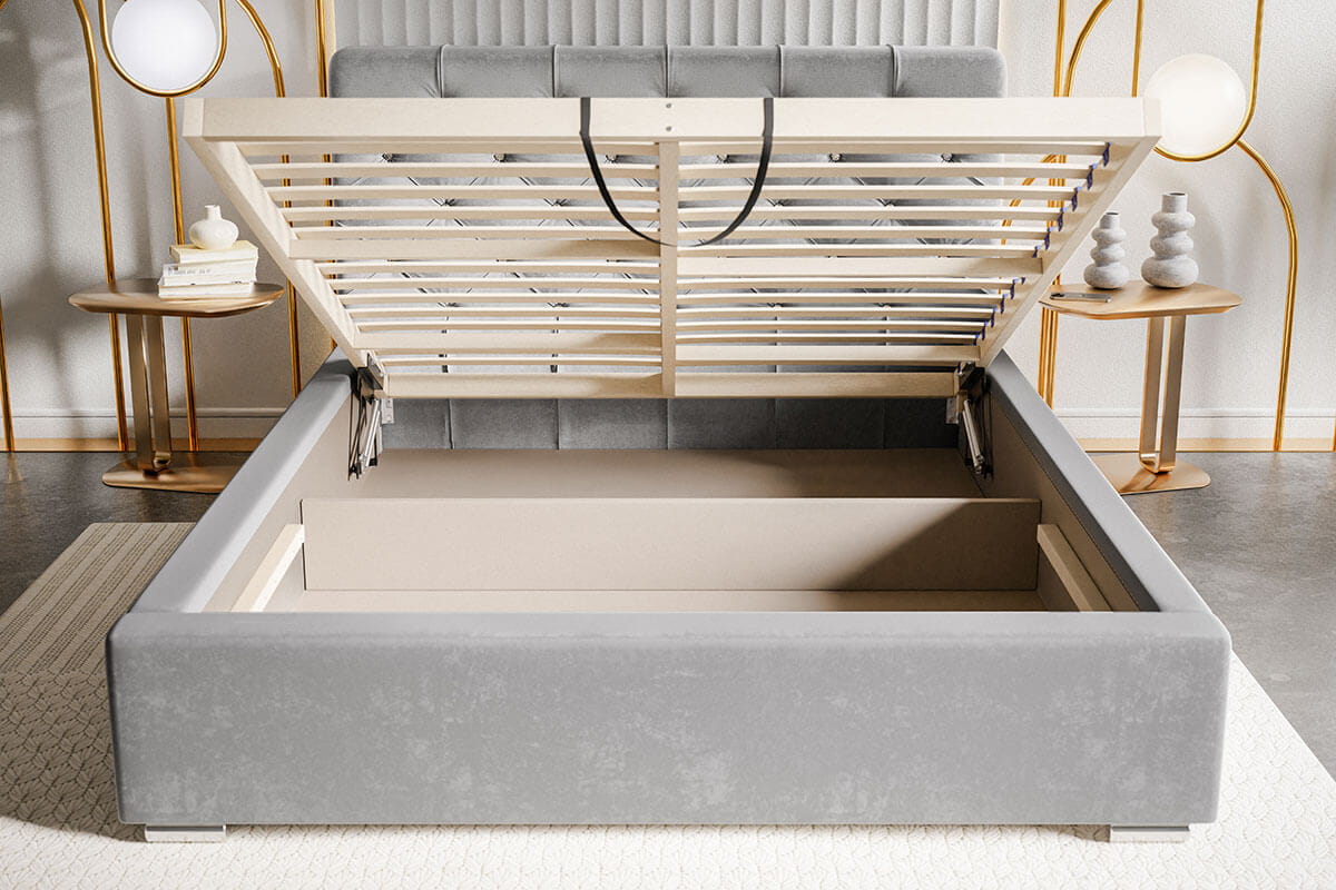 Łóżko tapicerowane 160x200 GRAYSON z pojemnikiem i stelażem szary welur