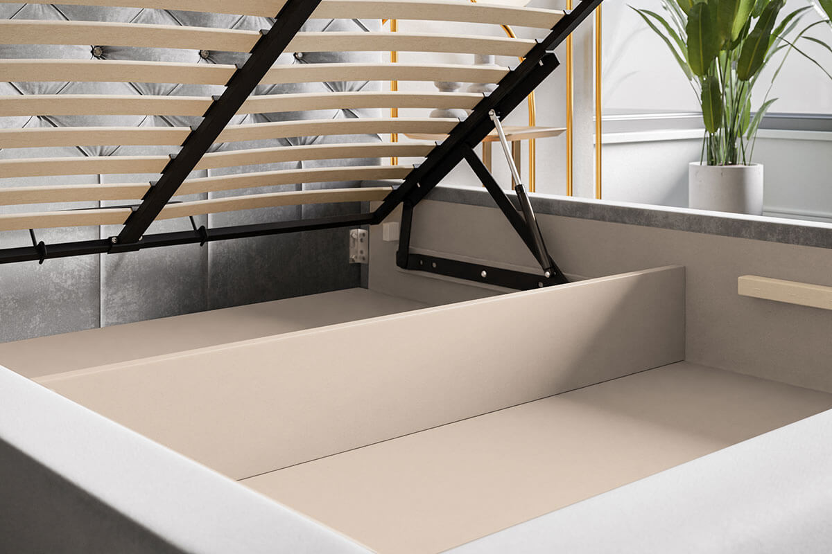 Łóżko tapicerowane 160x200 GRAYSON szare z pojemnikiem na pościel i stelażem