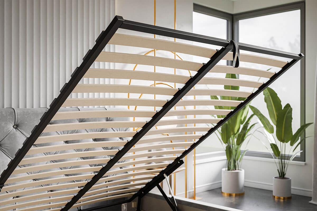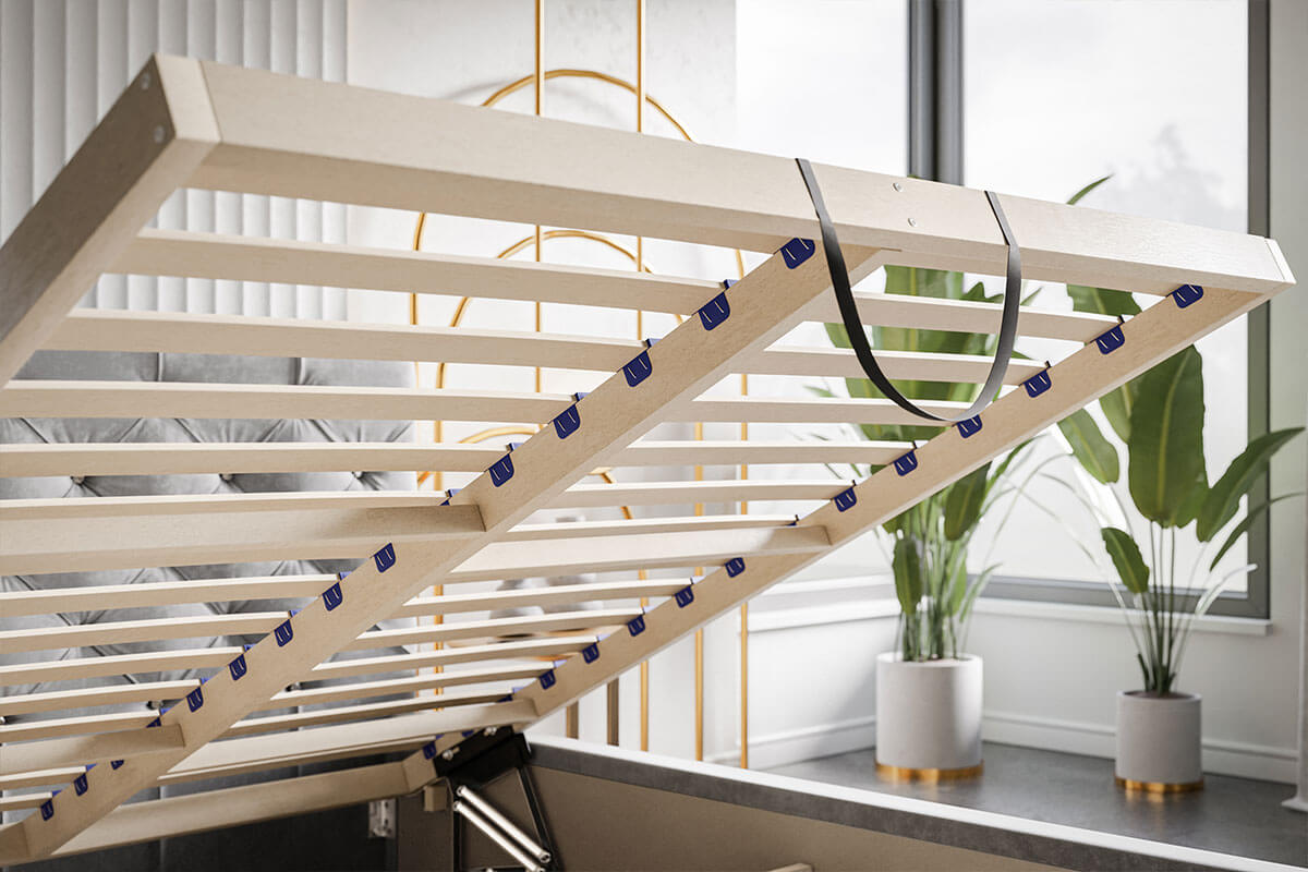 Łóżko tapicerowane Grayson z pojemnikiem na pościel i stelażem to kwintesencja elegancji, luksusu i nowoczesnego designu. Wyposażone w przestronny pojemnik na pościel, zapewnia praktyczne rozwiązania do przechowywania, pozwalając na łatwe utrzymanie porządku w sypialni.