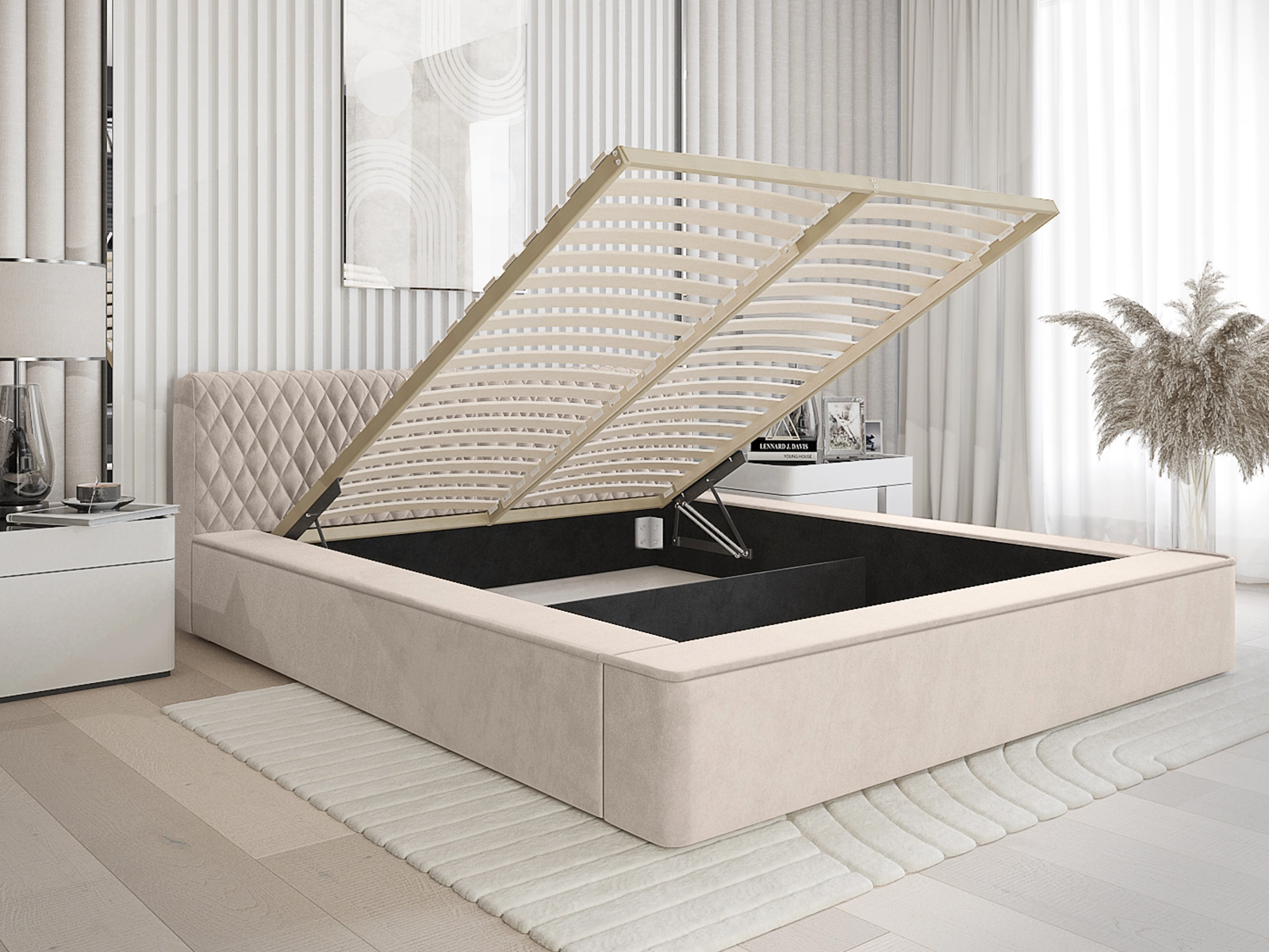 Łóżko tapicerowane 160x200 LAVA beżowa tkanina z pojemnikiem i stelażem