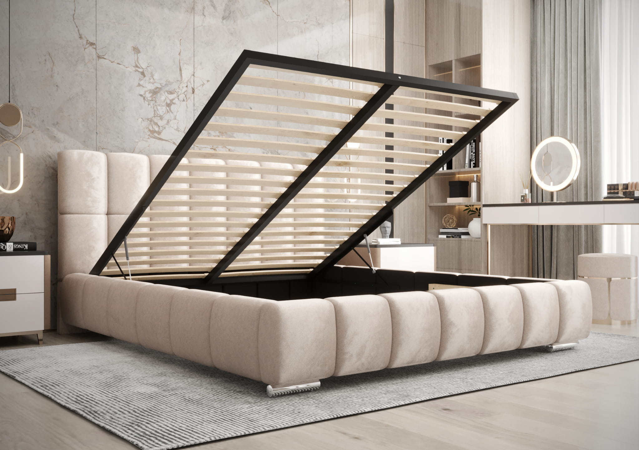 Łóżko tapicerowane 160x200 LUNI z pojemnikiem i stelażem beżowy welur