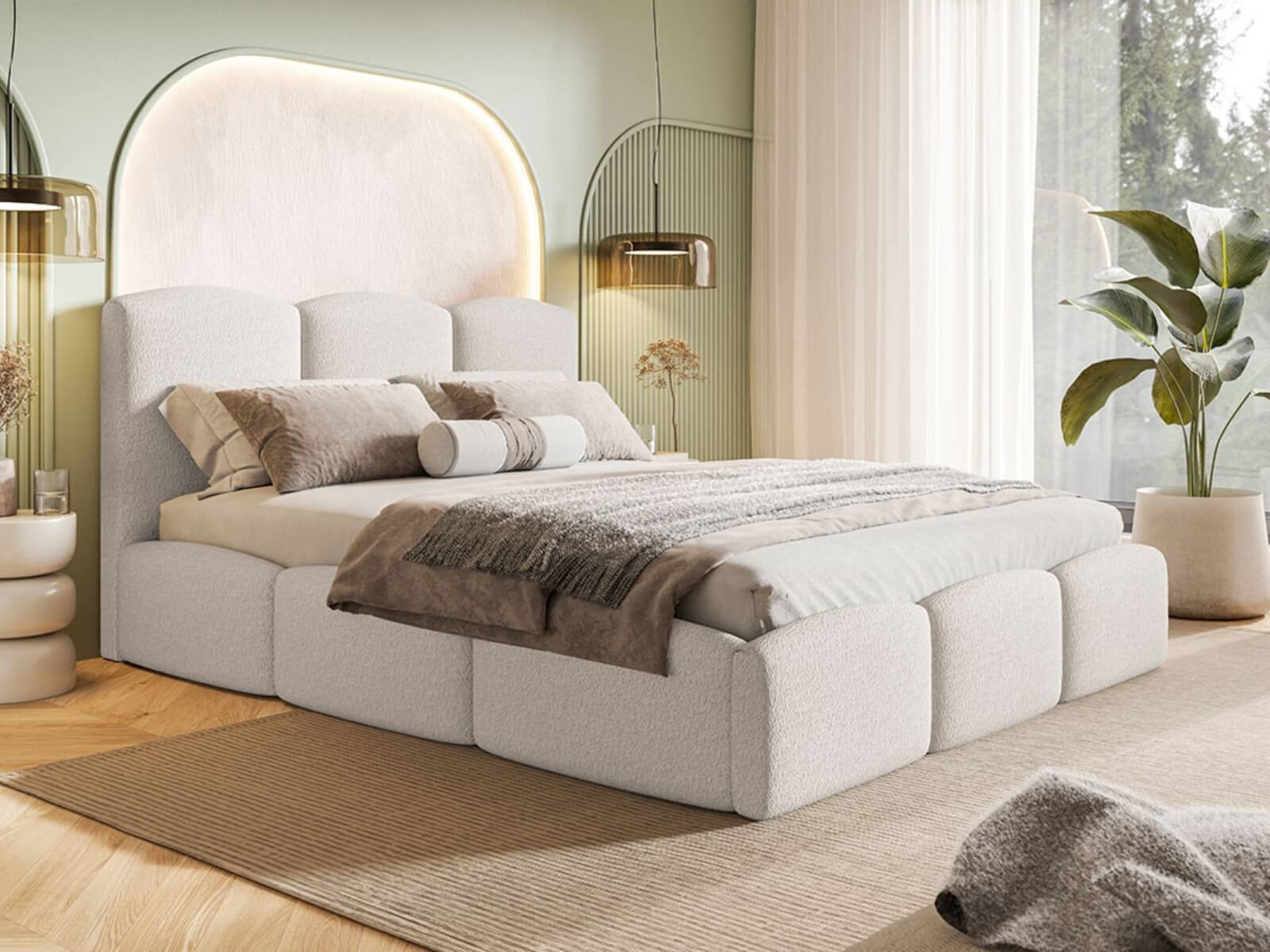 Łóżko Mahia Slim jest wyposażone w praktyczny pojemnik na pościel z dnem materiałowym oraz solidny stelaż, co zapewnia wygodę i trwałość na lata. Beżowy welur dodaje elegancji i subtelności, idealnie wpasowując się w nowoczesne wnętrze.