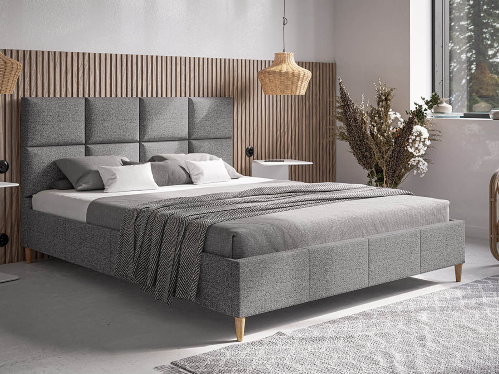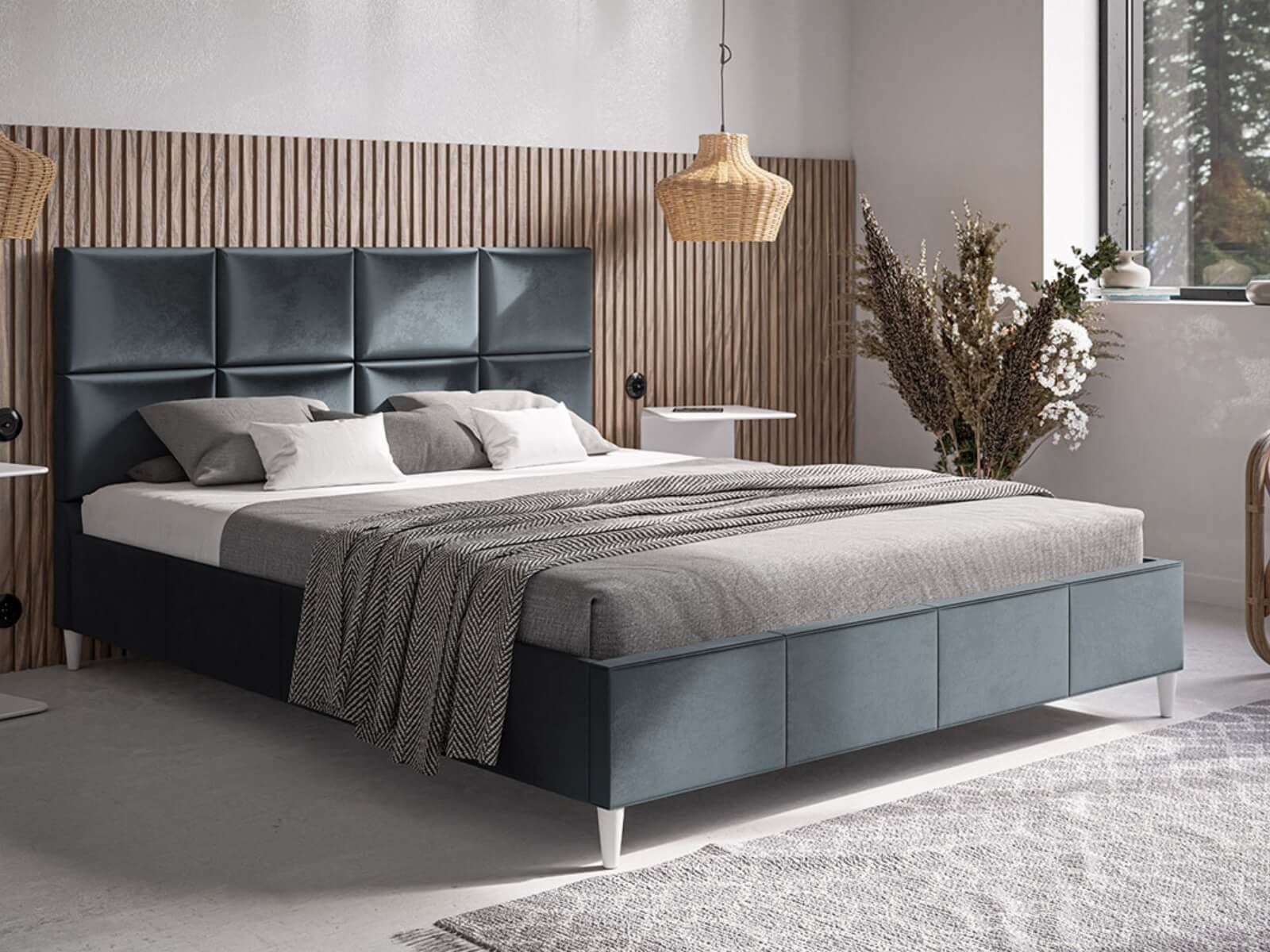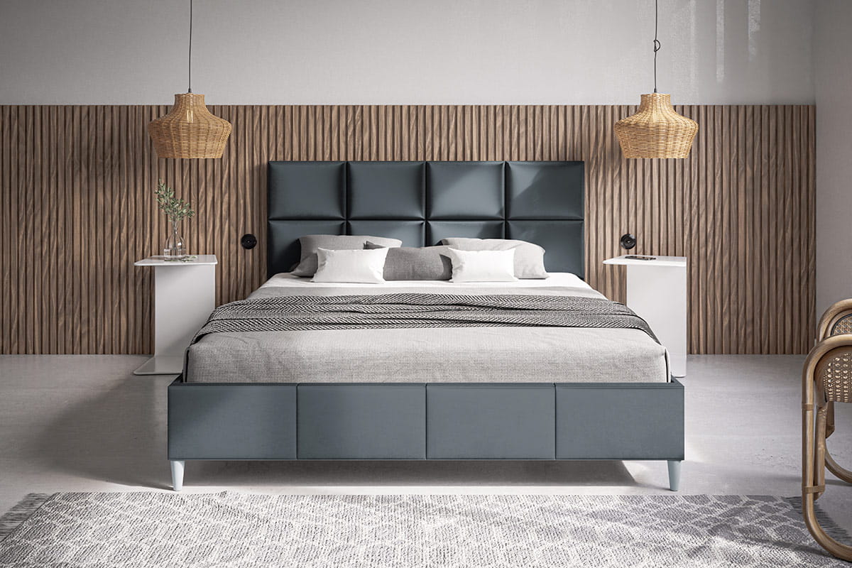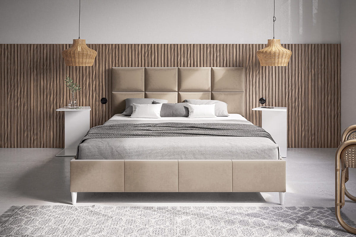 Centralnym elementem łóżka Mela jest elegancki zagłówek o kwadratowym wzorze, który dodaje całości wyjątkowego uroku i wyrafinowania. Mela nie posiada pojemnika na pościel, co podkreśla jego lekki wygląd, idealny do mniejszych przestrzeni i wnętrz inspirowanych skandynawską prostotą.