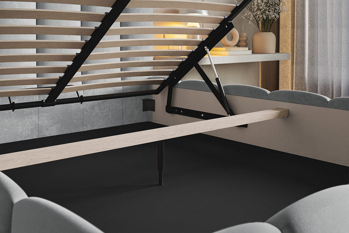 Dzięki temu łóżko tapicerowane z pojemnikiem pomaga utrzymać porządek i maksymalnie wykorzystać przestrzeń w sypialni.