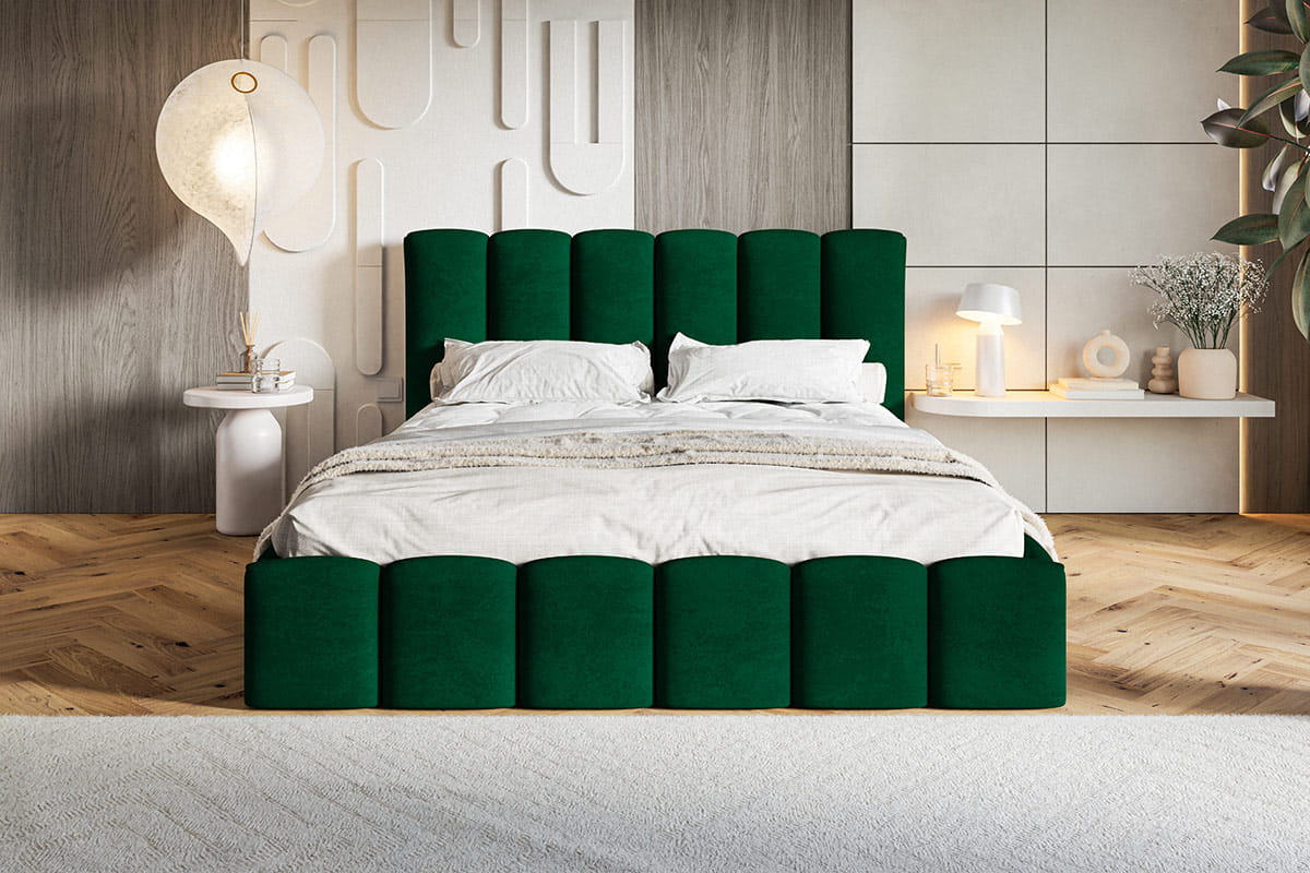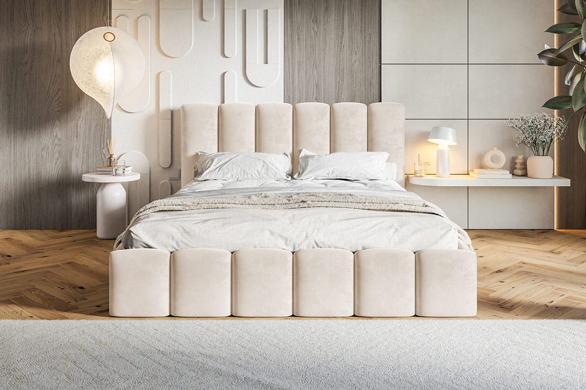 Dzięki temu łóżko tapicerowane z pojemnikiem pomaga utrzymać porządek i maksymalnie wykorzystać przestrzeń w sypialni.
