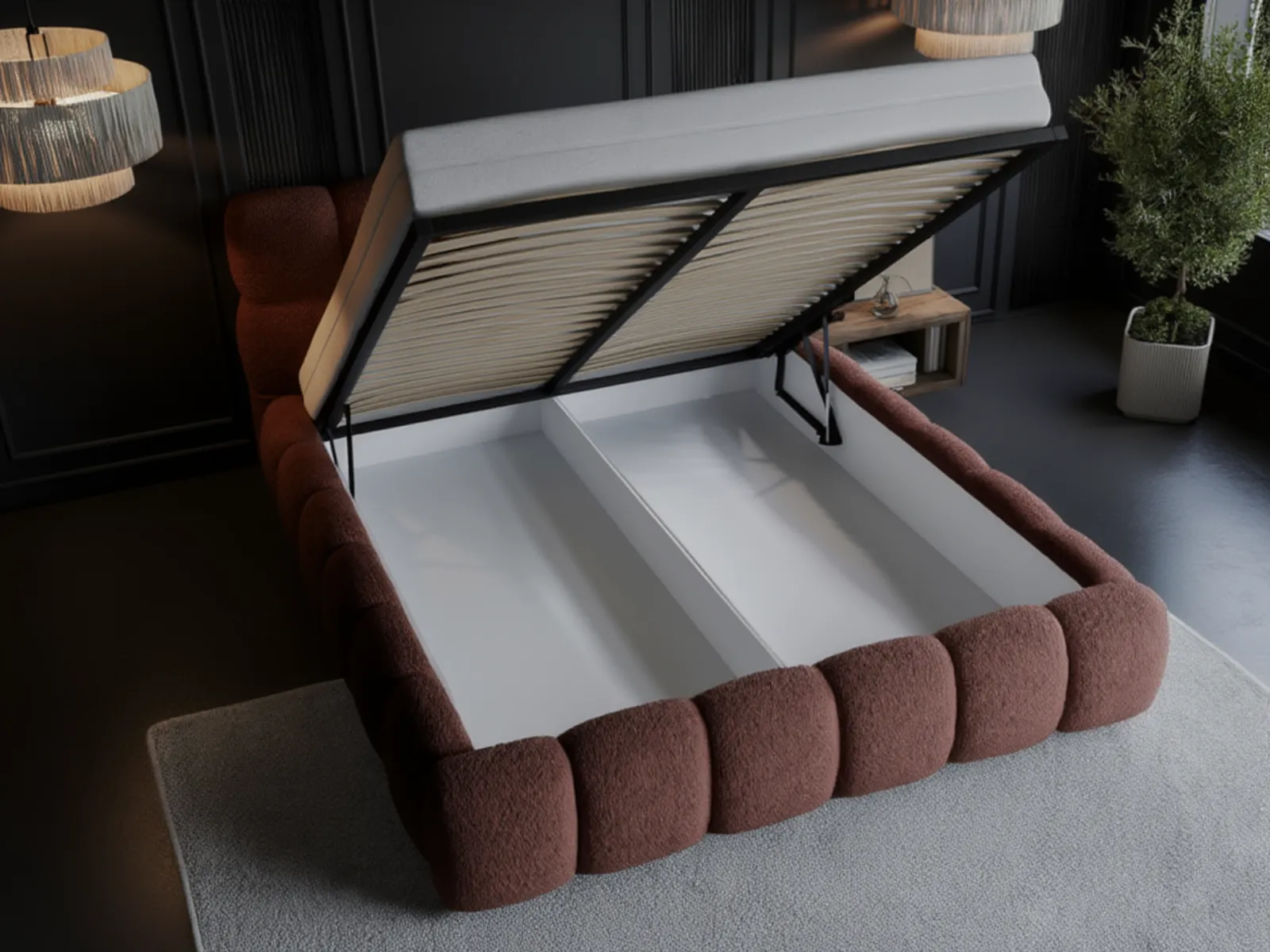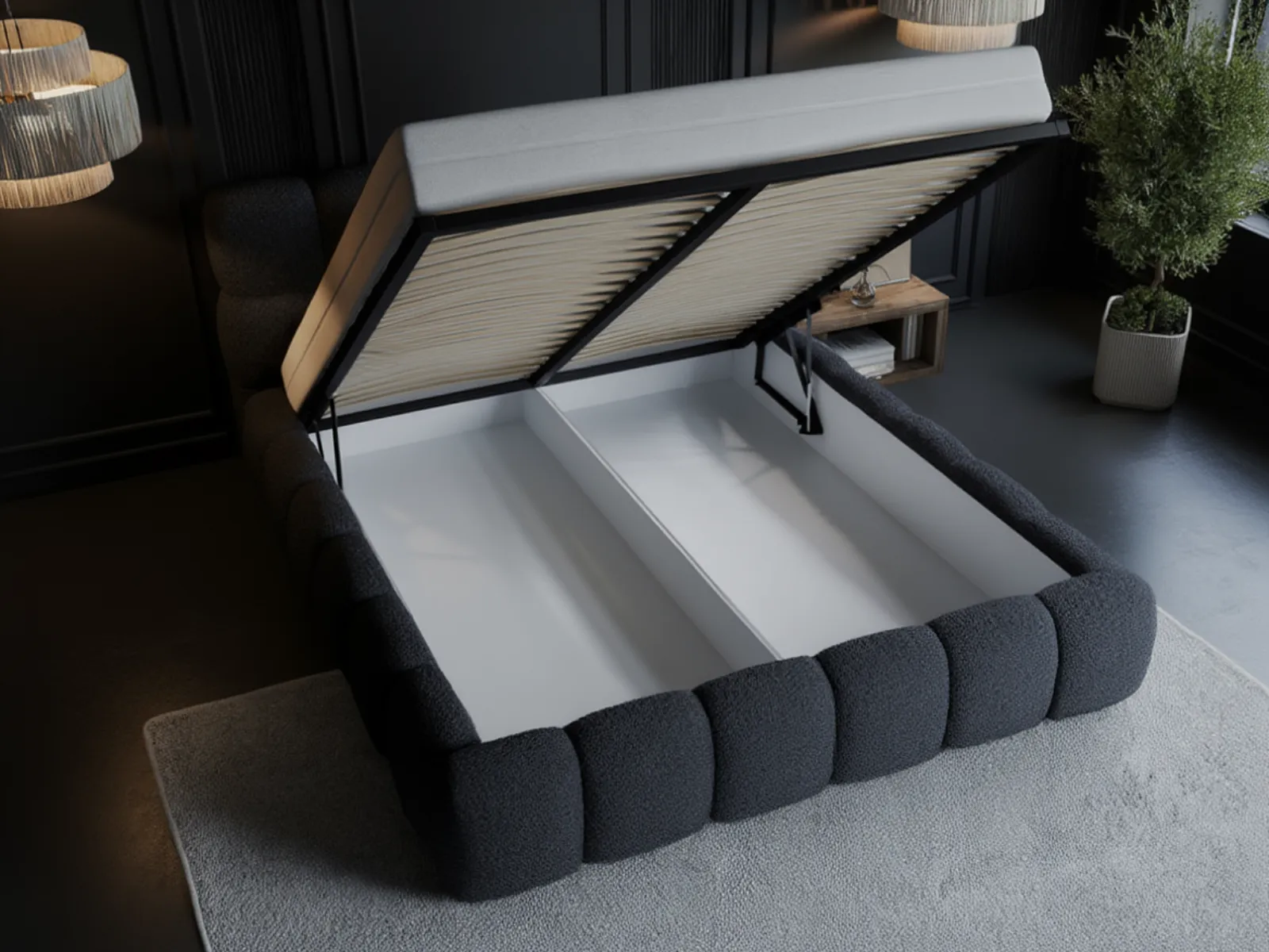 Łóżko tapicerowane 160x200 Virello z pojemnikiem i metalowym stelażem 48 listew - nowoczesne łóżko w boucle do eleganckiej sypialni