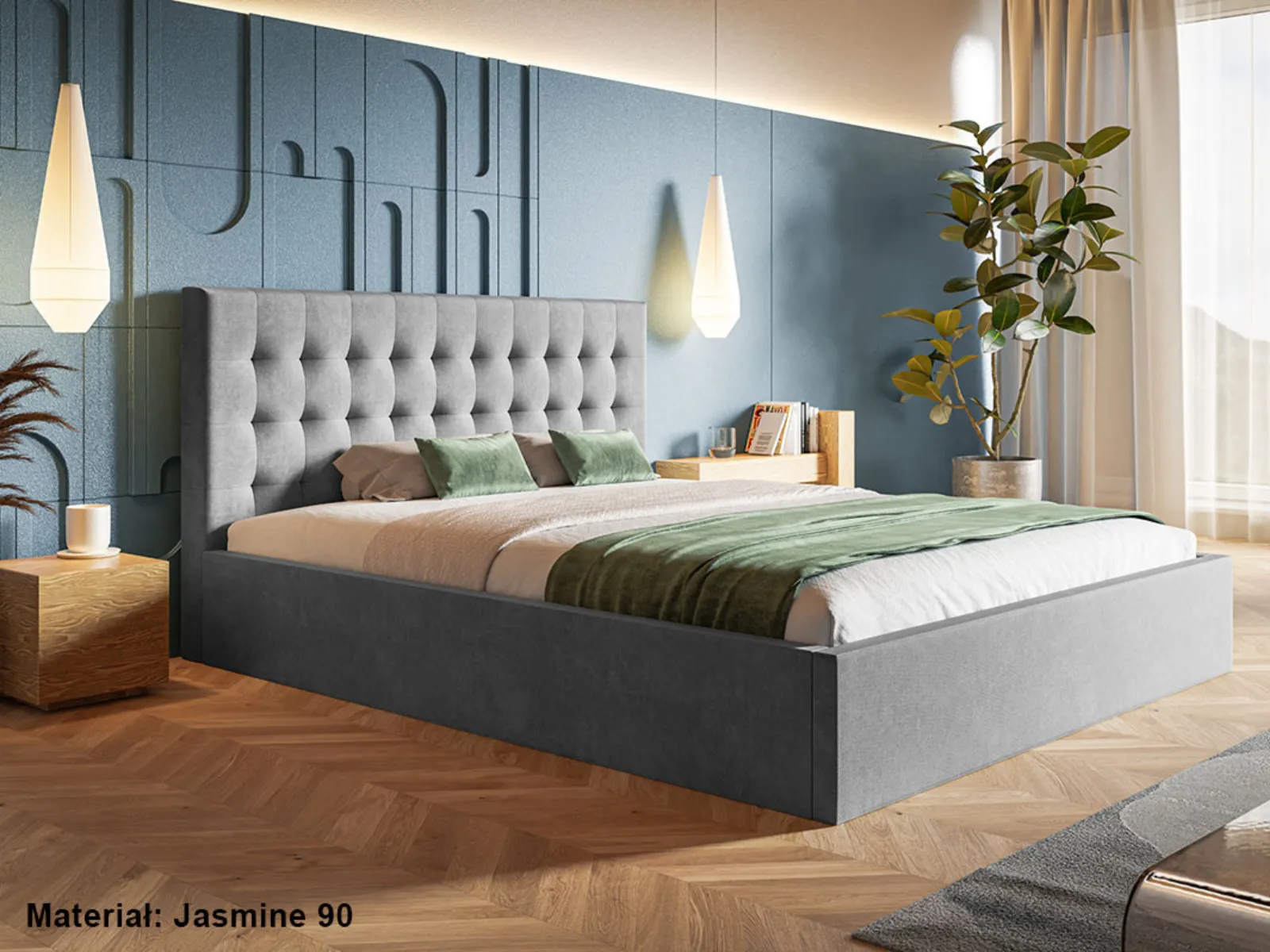 - Typ łóżka: Tapicerowane z pojemnikiem na pościel