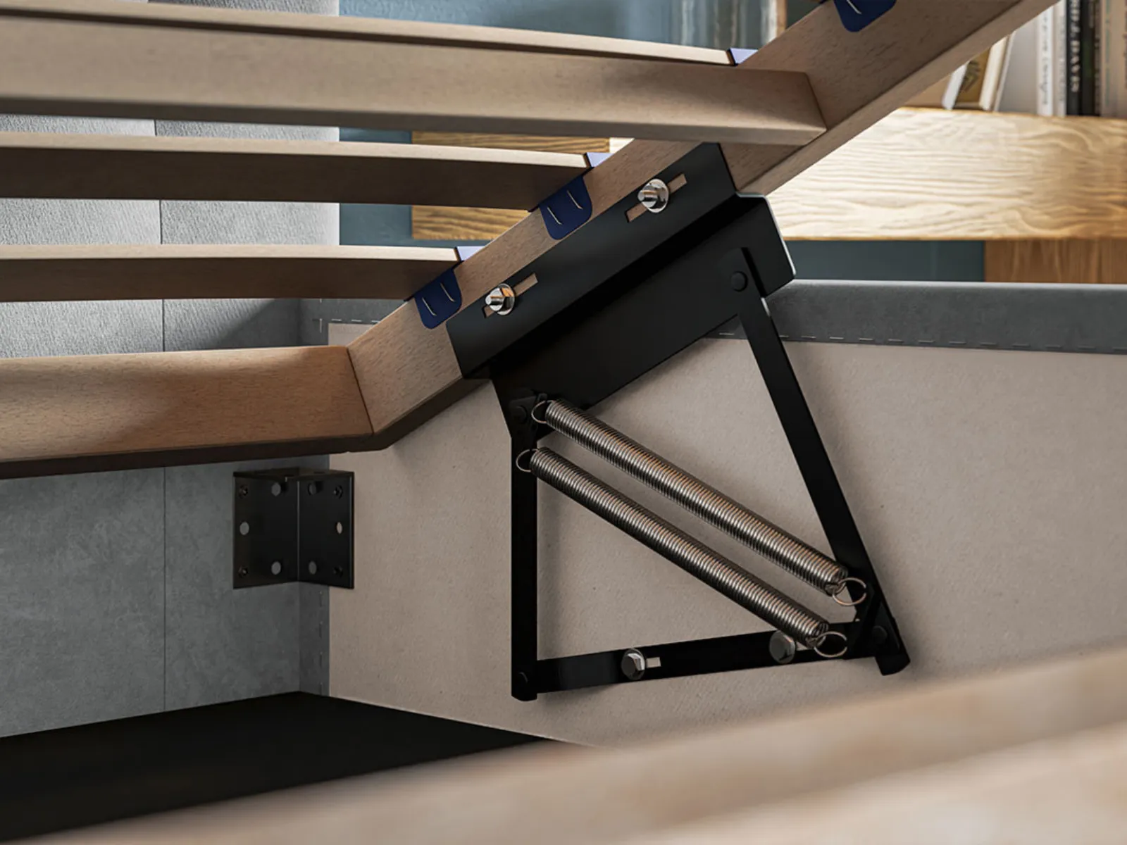 - Stelaż drewniany w standardzie – elastyczne listwy zapewniają odpowiednie podparcie dla materaca oraz prawidłową wentylację.