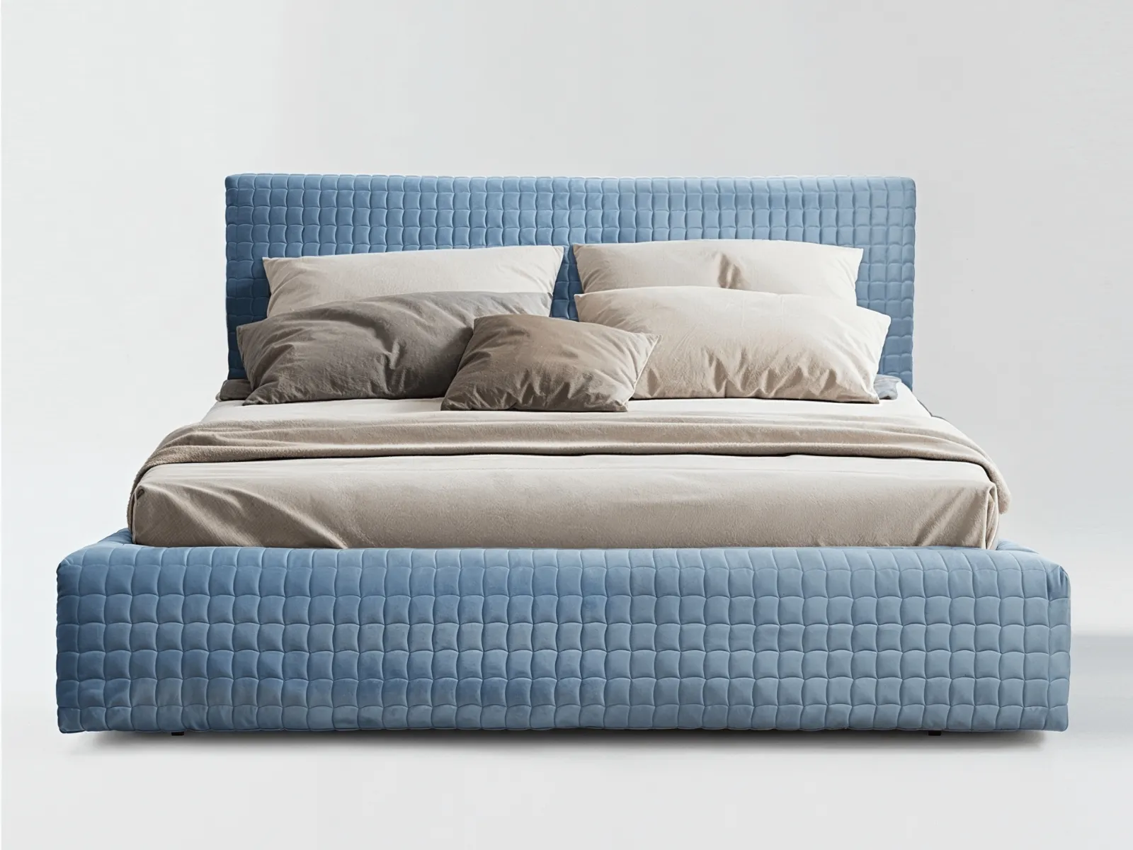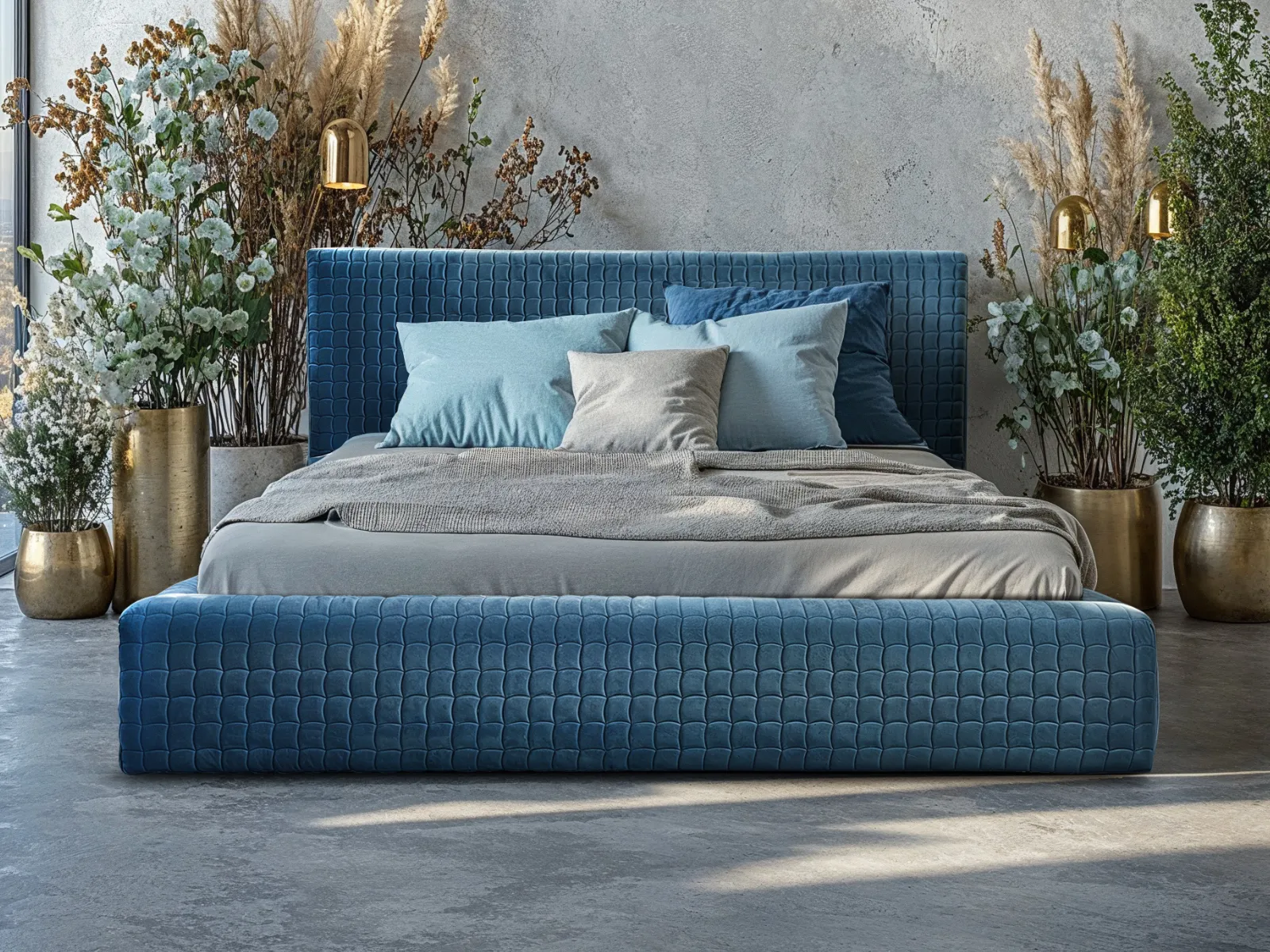 Łóżko tapicerowane LUNO to doskonały wybór dla osób, które poszukują połączenia eleganckiego designu, funkcjonalnych rozwiązań oraz solidnego wykonania. Minimalistyczna forma w połączeniu z miękką, welurową tkaniną w kolorze niebieskim wprowadza do sypialni atmosferę spokoju, lekkości i luksusu. Subtelna struktura materiału pięknie odbija światło, nadając wnętrzu głębi i przytulnego charakteru.