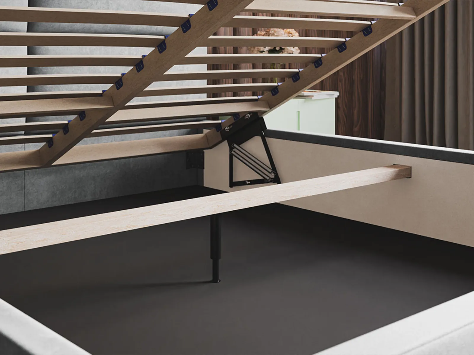 - Stelaż drewniany w standardzie – elastyczne listwy wspierające komfort snu i wentylację materaca.