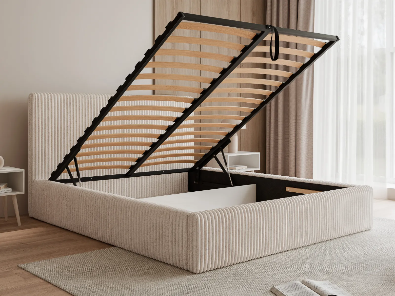 Łóżko tapicerowane 200x200 MIRELLA z pojemnikiem i stelażem, beżowy sztruks