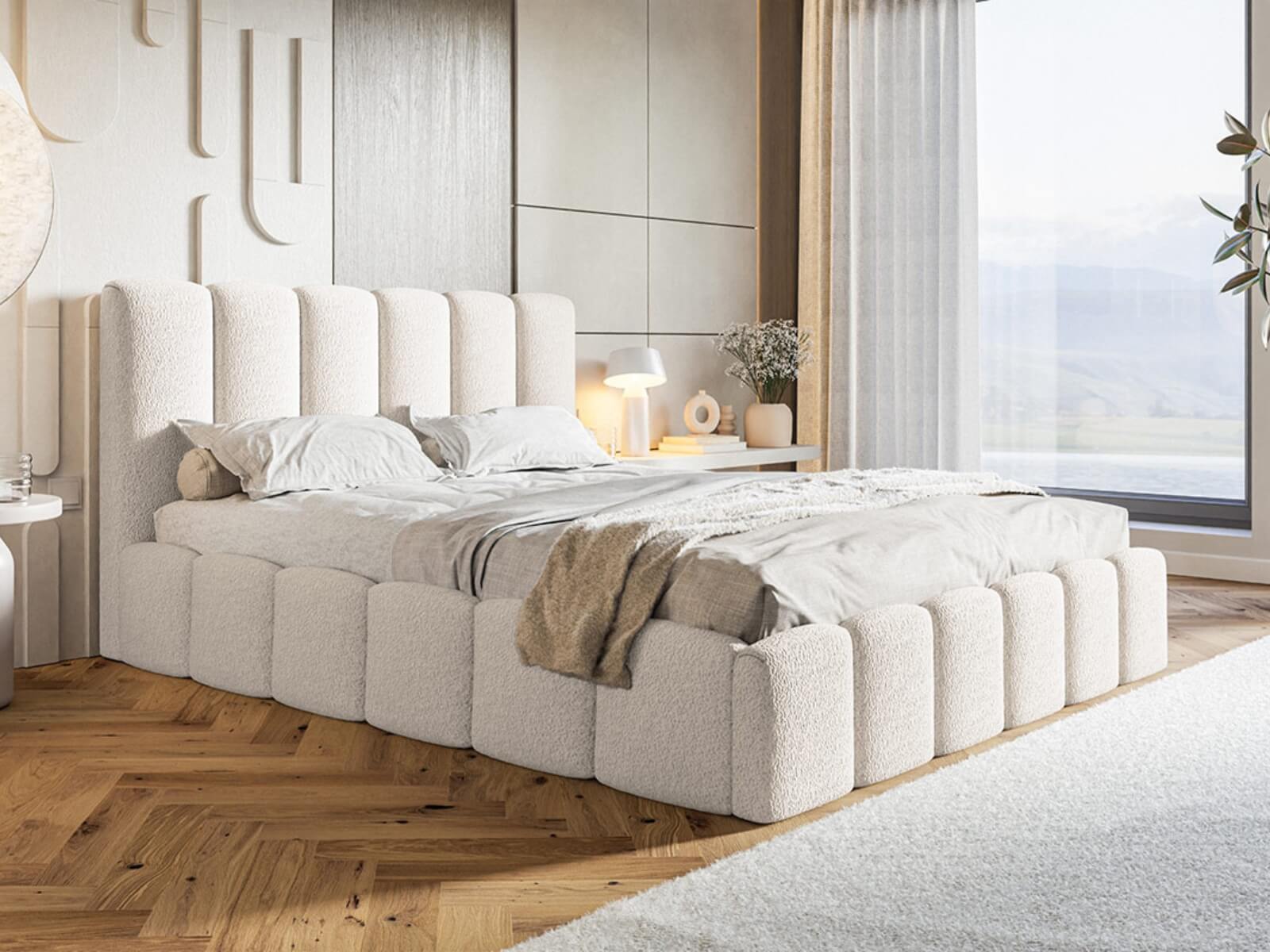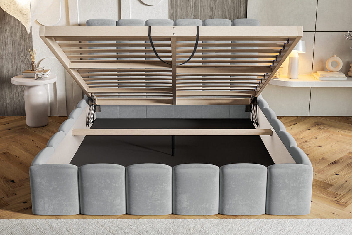 Dzięki temu łóżko tapicerowane z pojemnikiem pomaga utrzymać porządek i maksymalnie wykorzystać przestrzeń w sypialni.