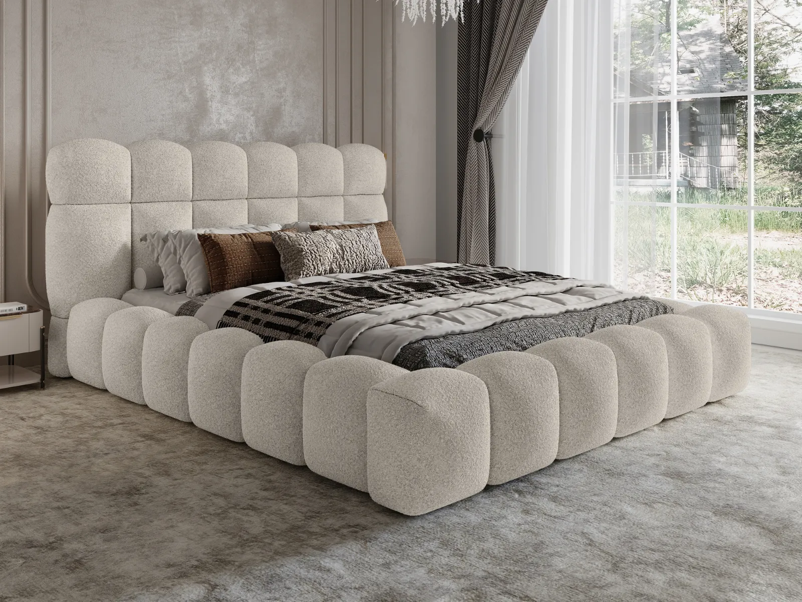Wykonane w modnej tkaninie bouclé Quelle, łóżko wprowadza do sypialni ciepło, teksturę i styl, który nigdy nie wychodzi z mody.