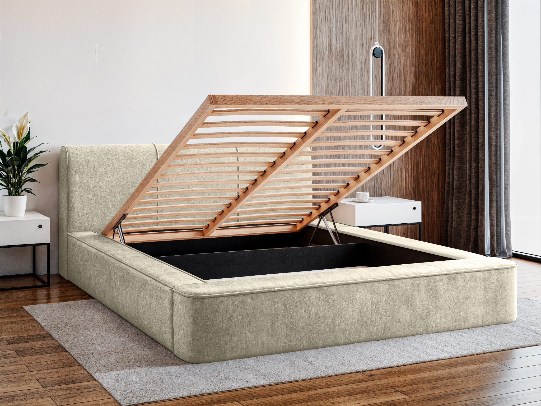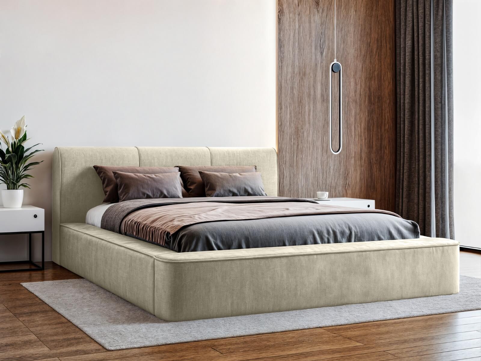 Łóżko tapicerowane 200x200 RENE z pojemnikiem i metalowym stelażem, beżowy szenil
