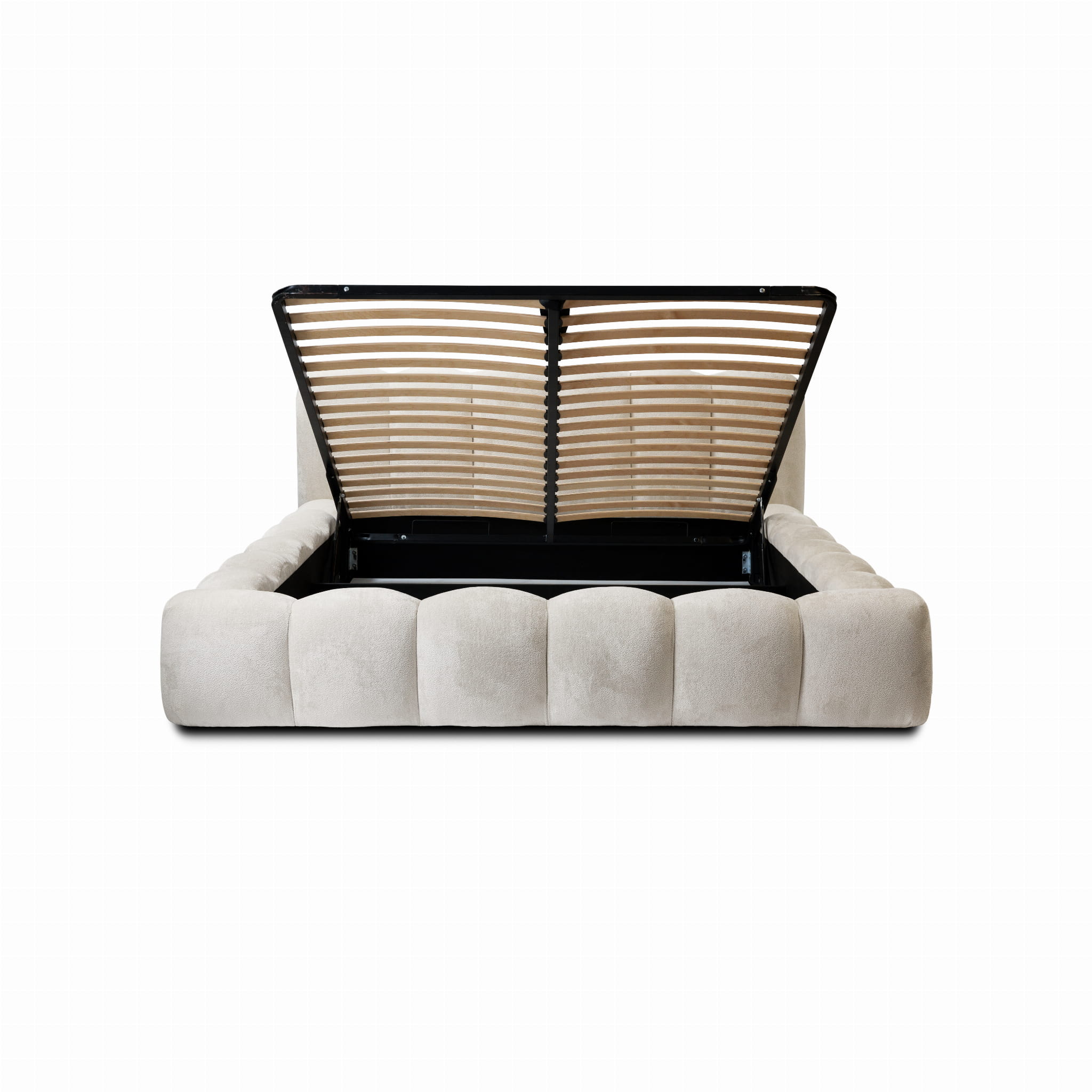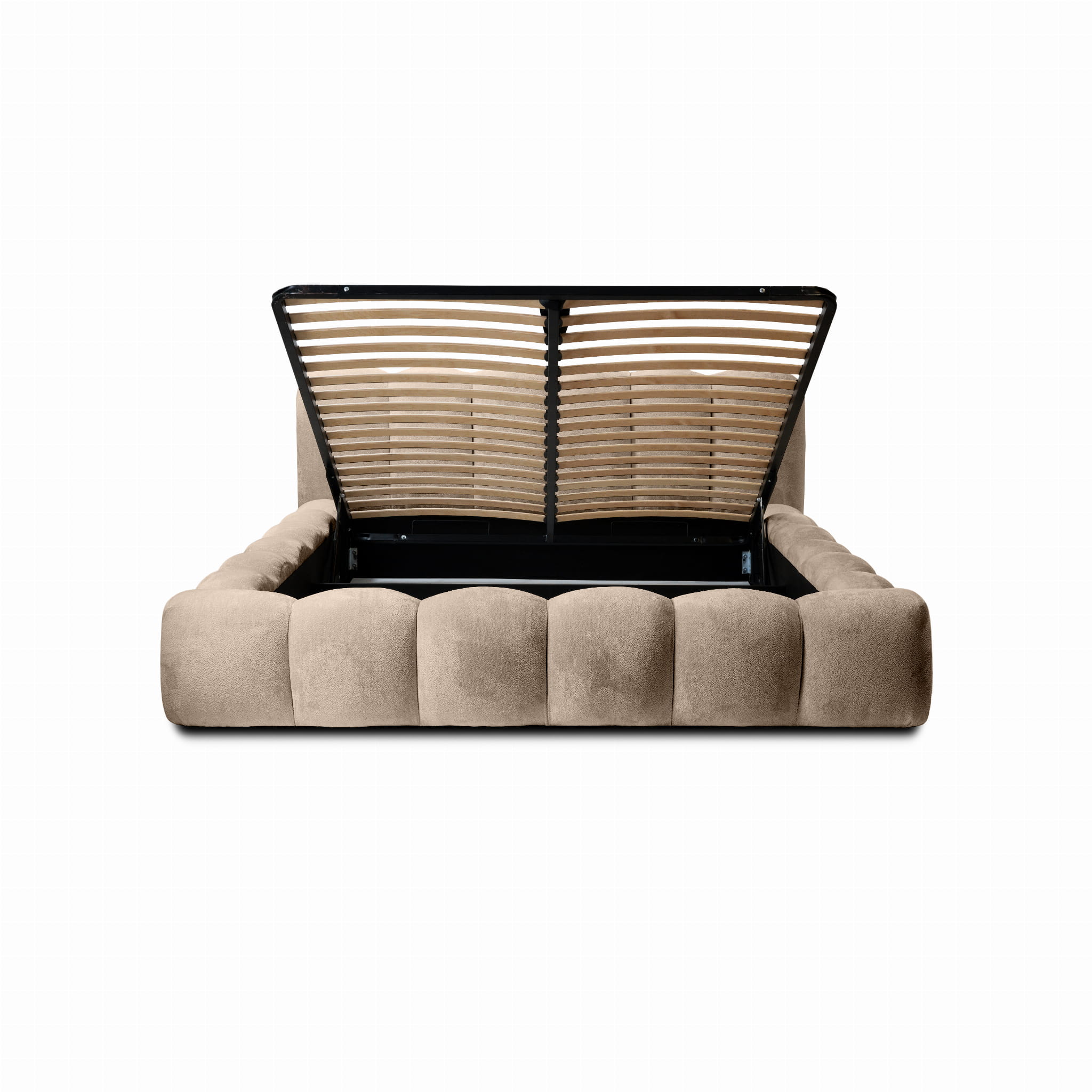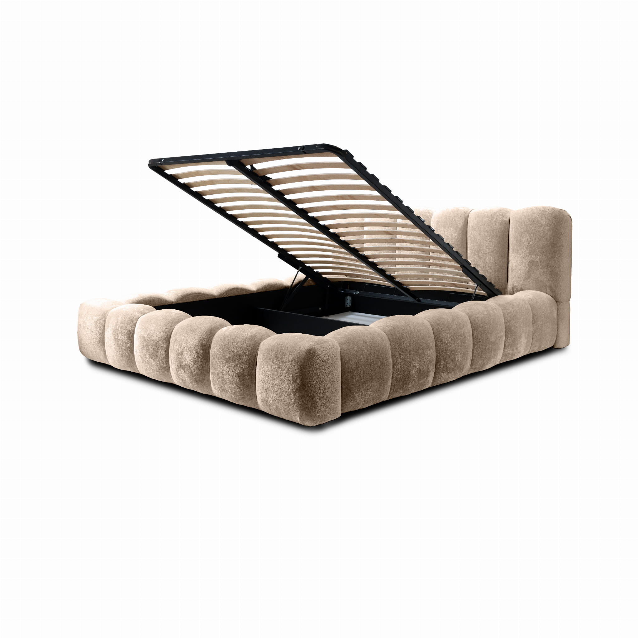 Łóżko tapicerowane 200x200 ROSA beżowa tkanina z pojemnikiem i metalowym stelażem