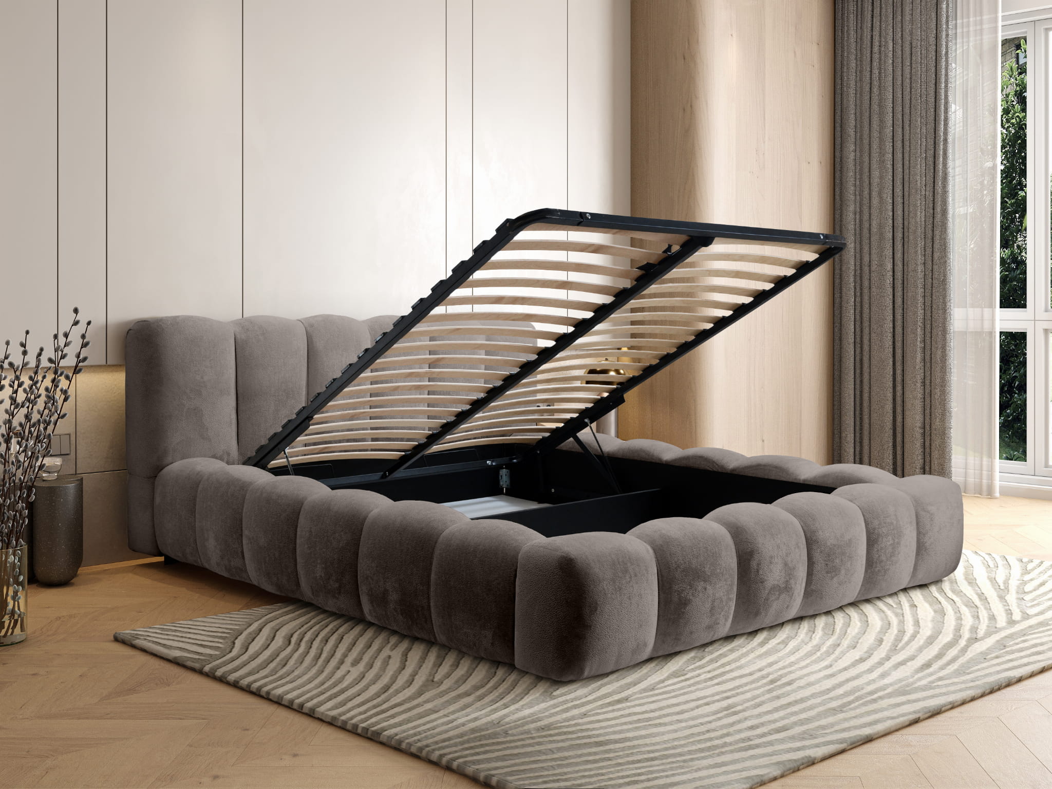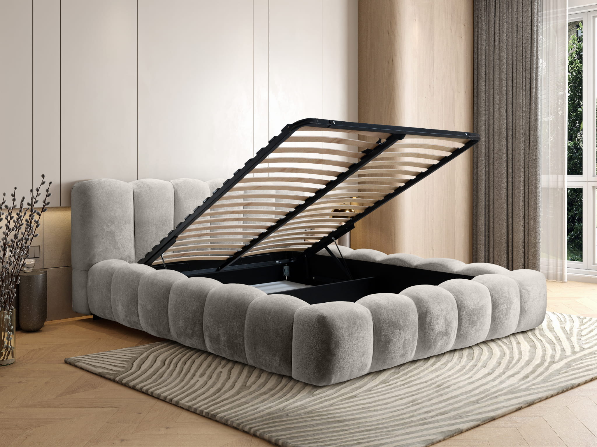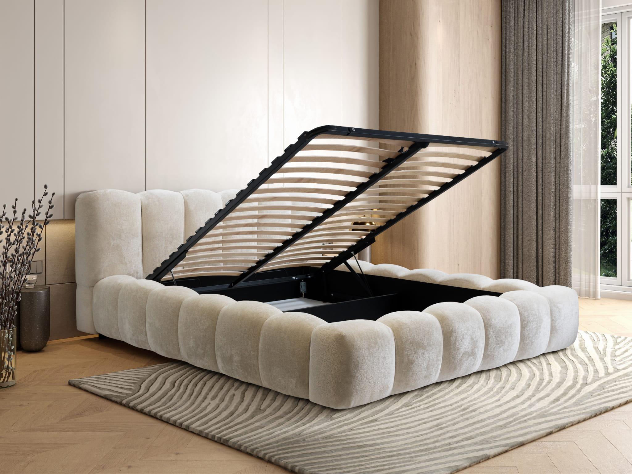 Łóżko tapicerowane 200x200 ROSA z metalowym stelażem i pojemnikiem beżowe szenilowe