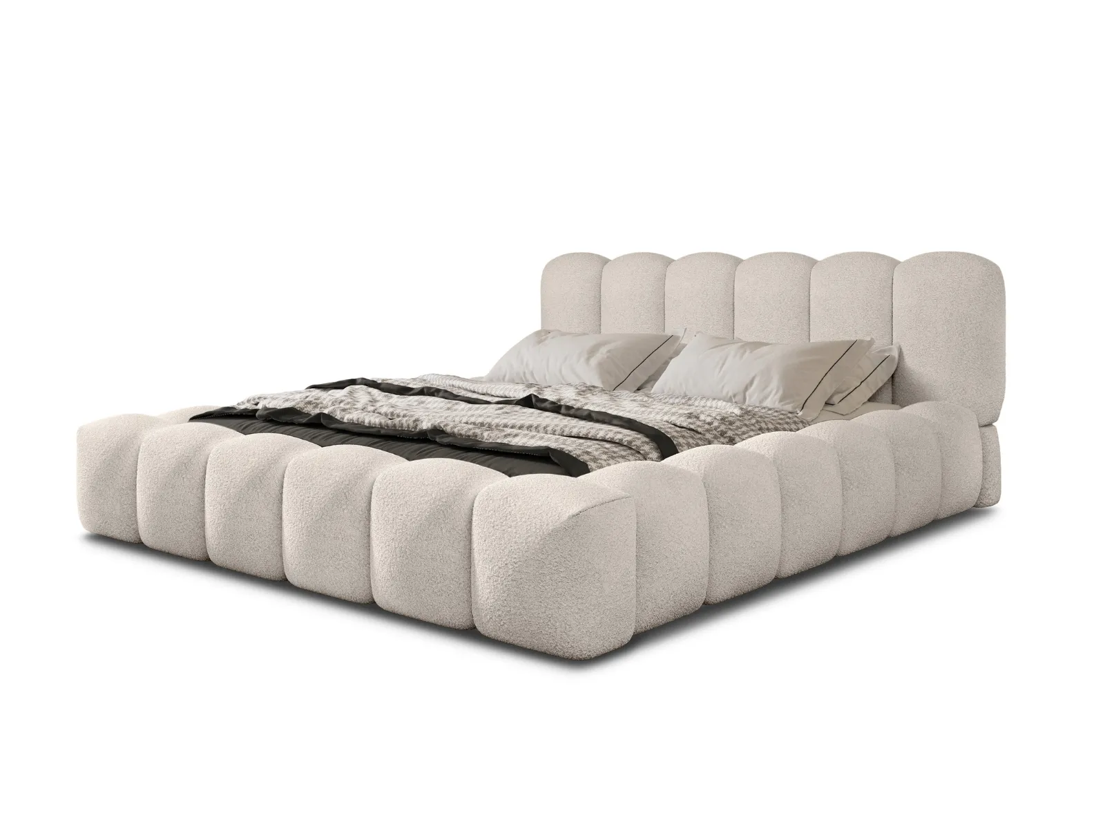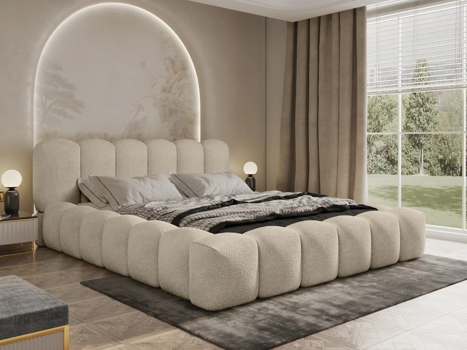 Łóżko tapicerowane 200x200 Rosa z pojemnikiem i stelażem w tkaninie bouclé Quelle ecru