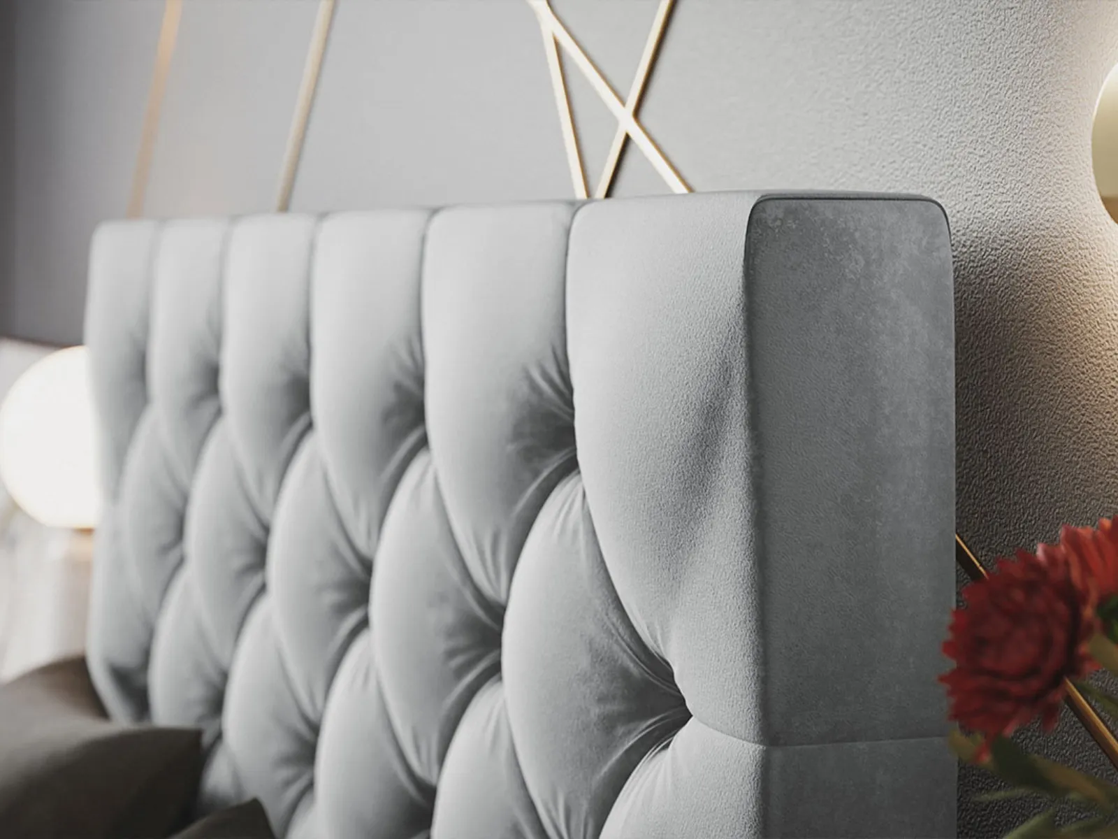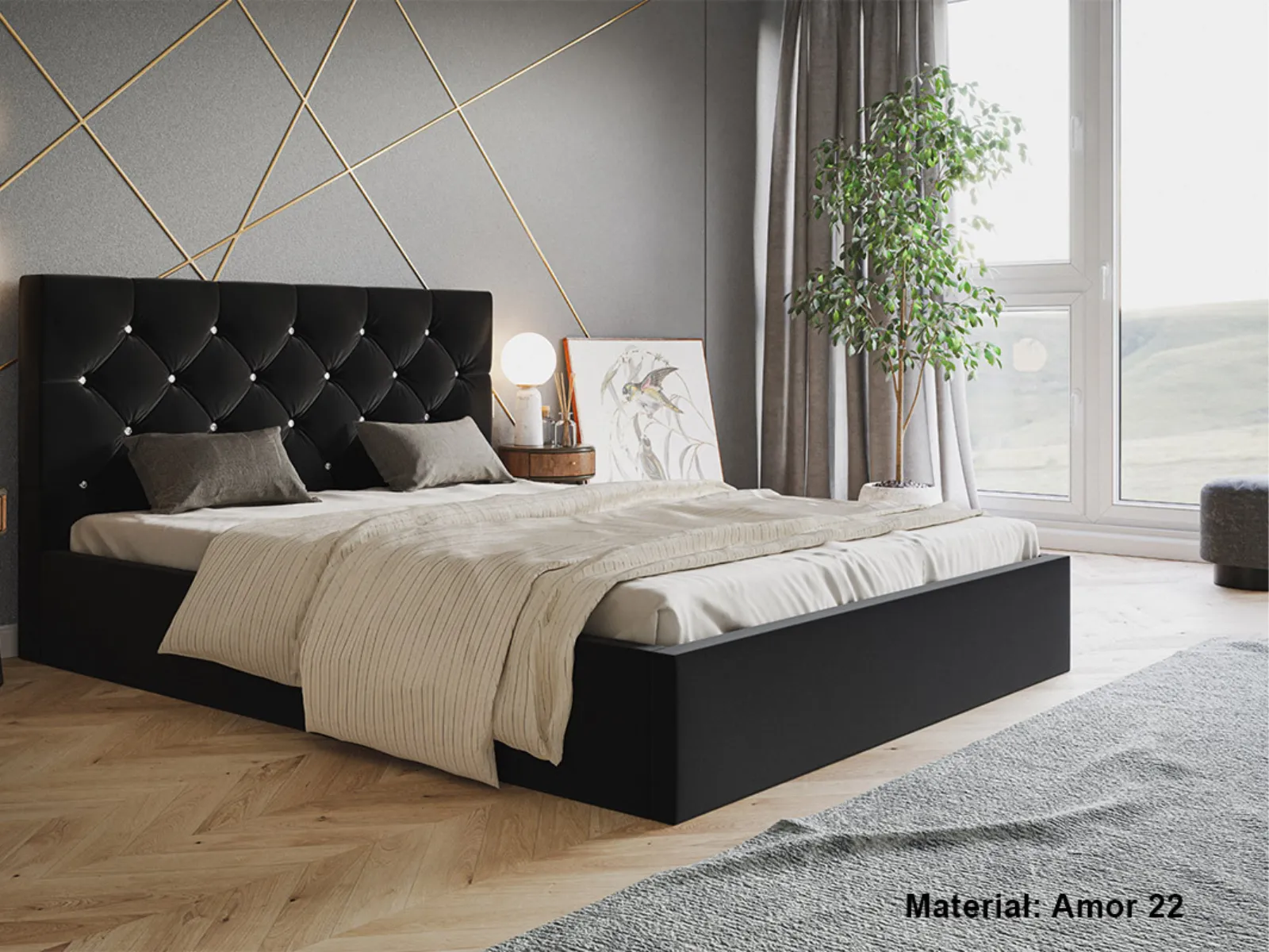 - Tapicerowany zagłówek z kryształkami – elegancki, wysoki zagłówek z dekoracyjnym pikowaniem i kryształowymi elementami.