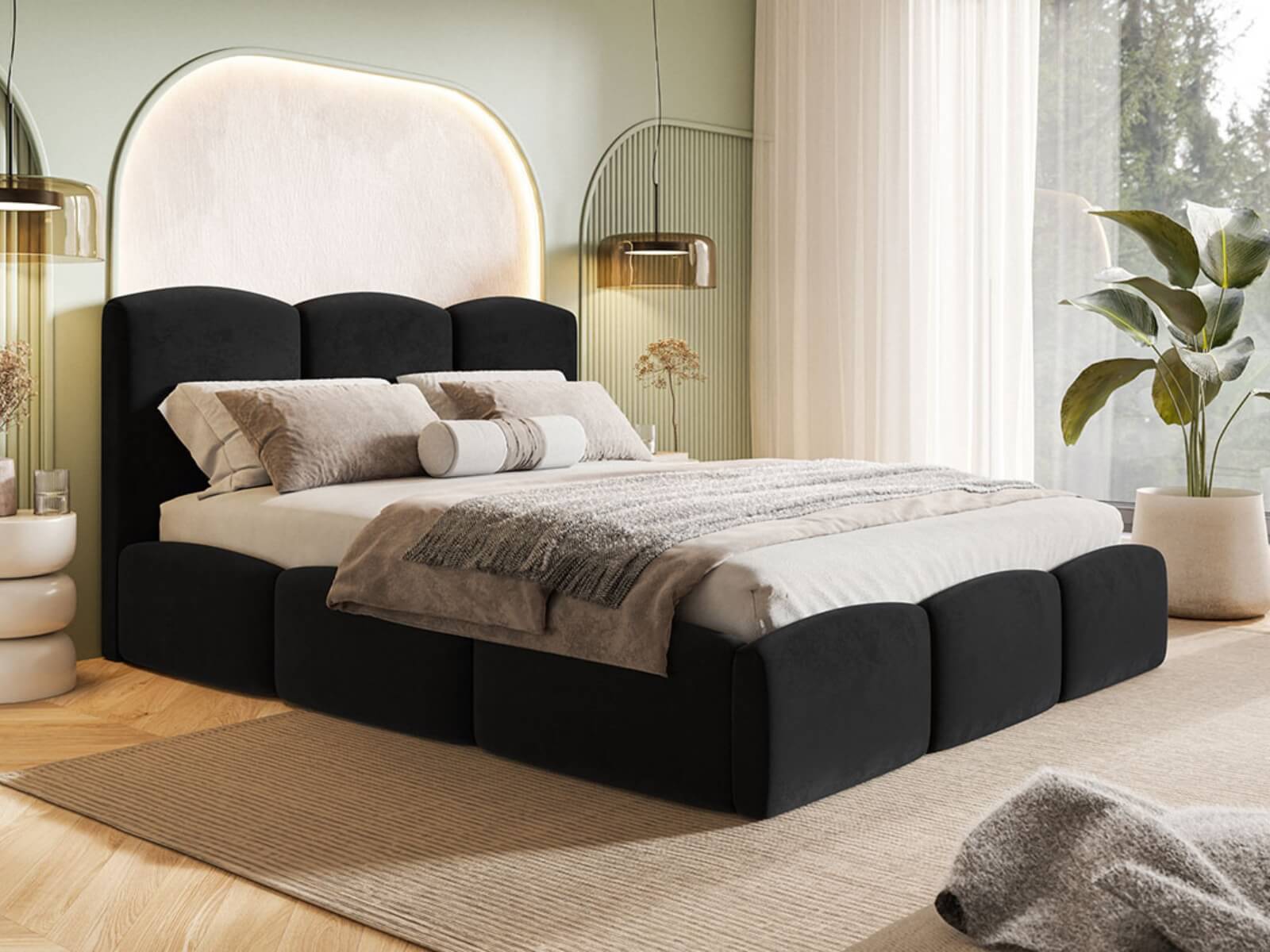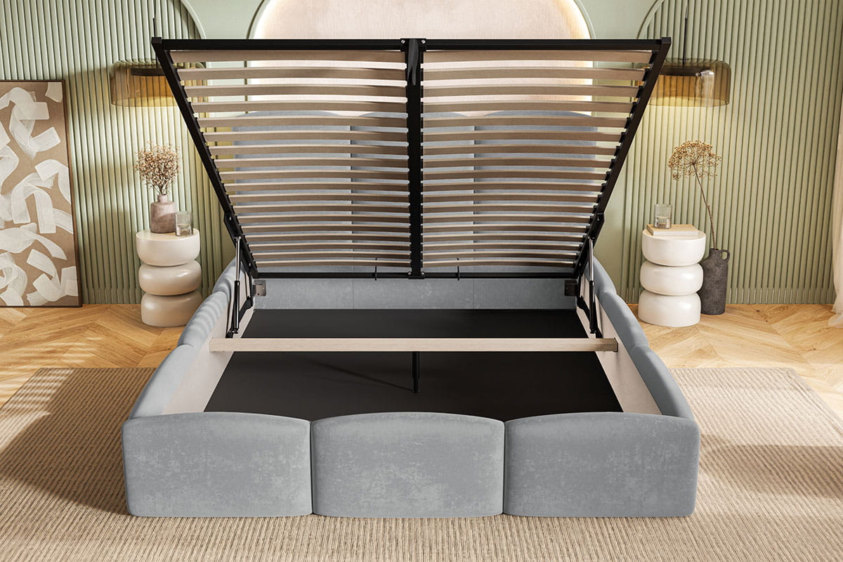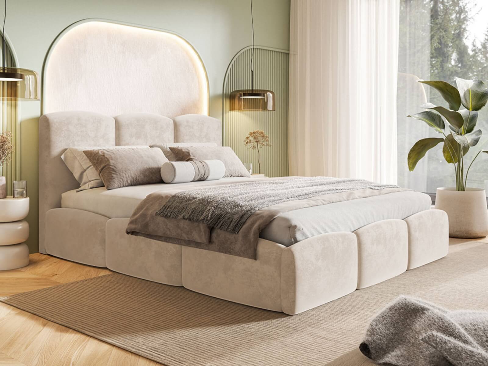 Łóżko Mahia Slim jest wyposażone w praktyczny pojemnik na pościel z dnem materiałowym oraz solidny stelaż, co zapewnia wygodę i trwałość na lata. Beżowy welur dodaje elegancji i subtelności, idealnie wpasowując się w nowoczesne wnętrze.