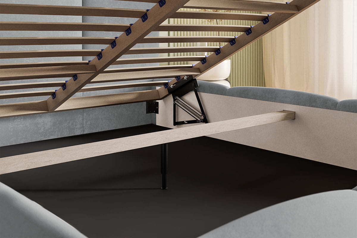 Łóżko Mahia Slim jest wyposażone w praktyczny pojemnik na pościel z dnem materiałowym oraz solidny stelaż, co zapewnia wygodę i trwałość na lata. Szary welur dodaje elegancji i subtelności, idealnie wpasowując się w nowoczesne wnętrze.
