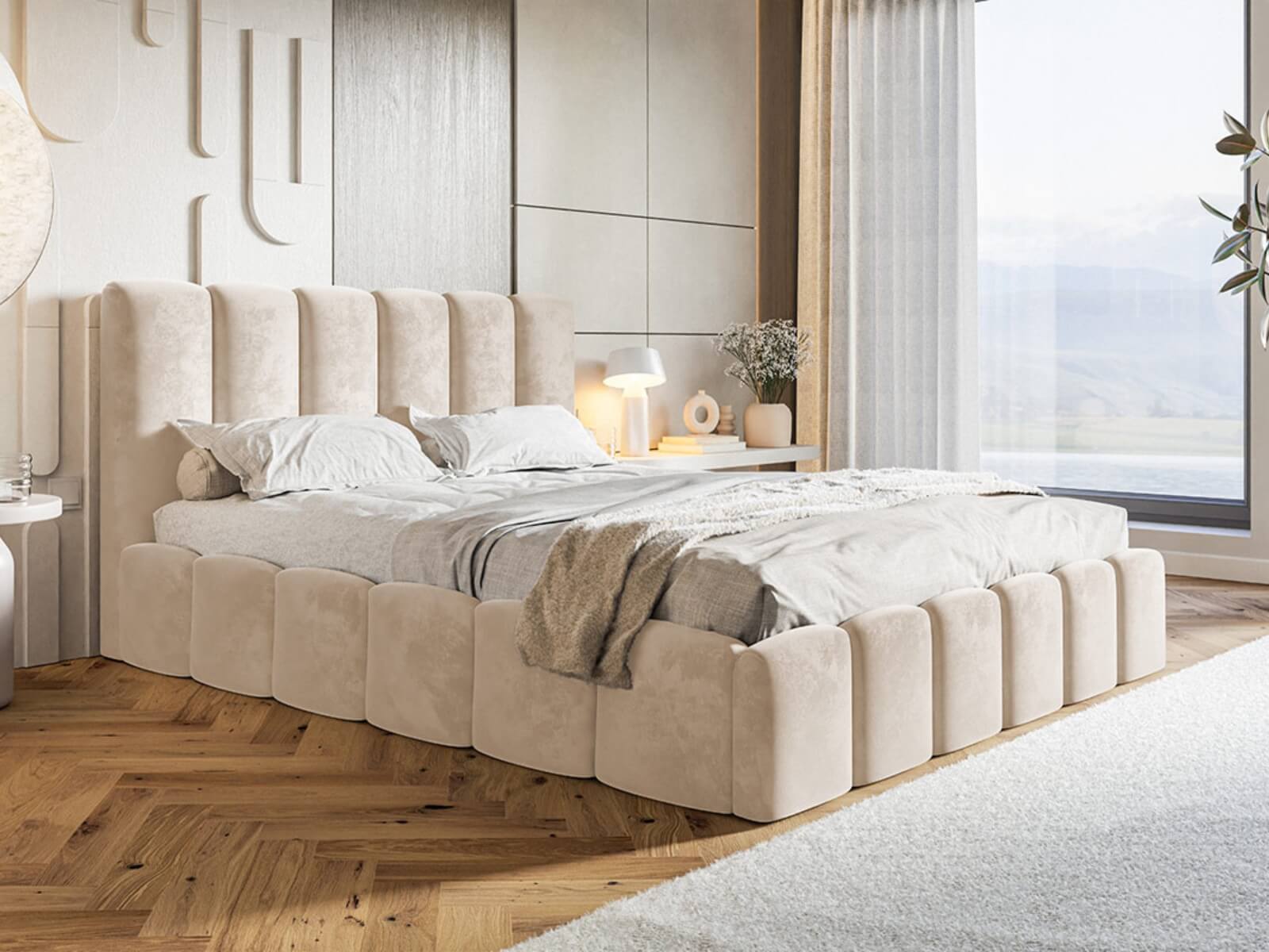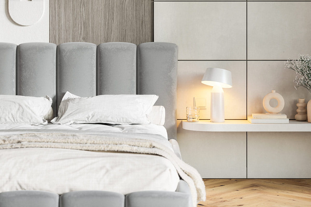 Dzięki temu łóżko tapicerowane z pojemnikiem pomaga utrzymać porządek i maksymalnie wykorzystać przestrzeń w sypialni.