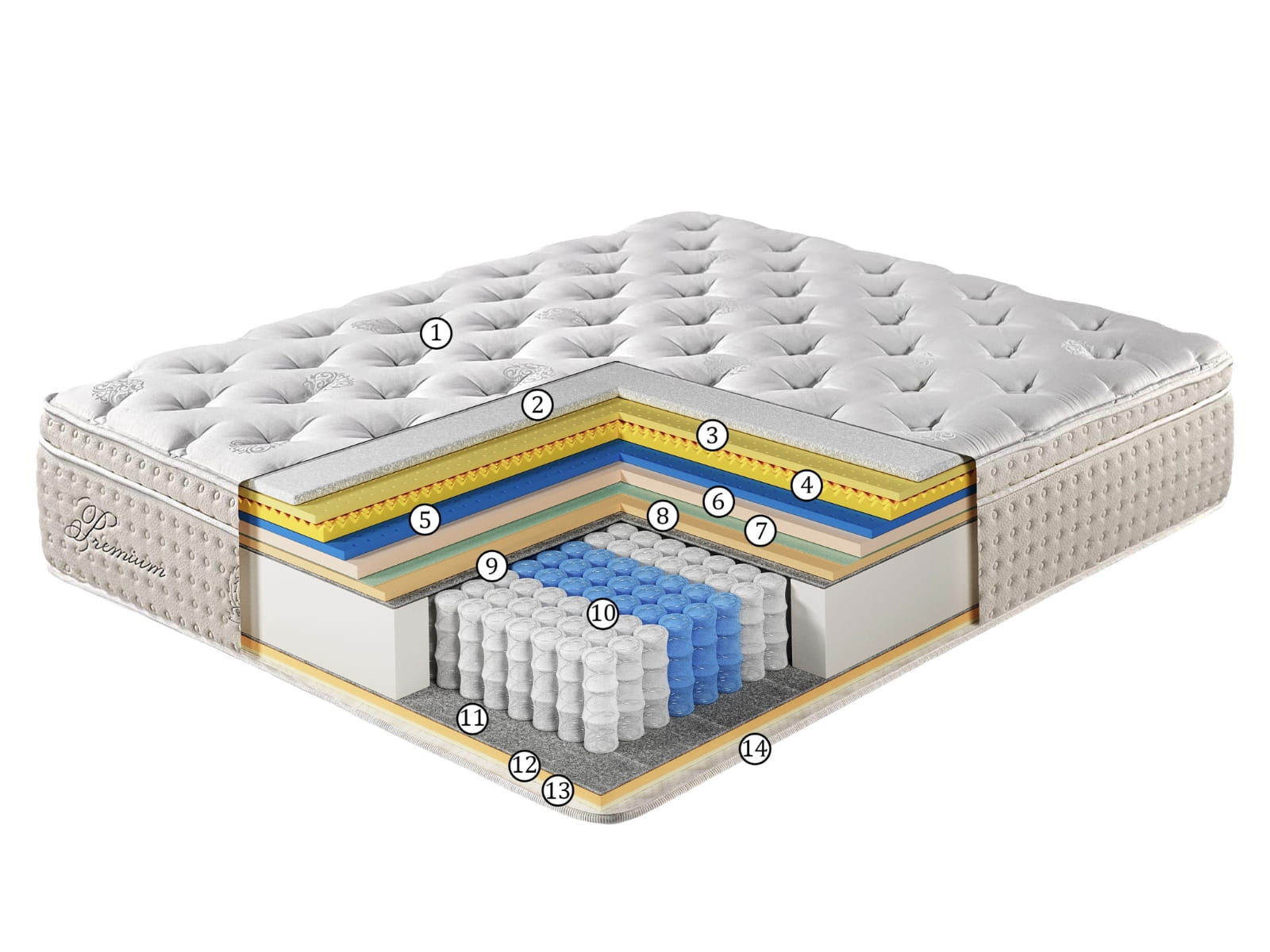 Zbudowany z 14 warstw, każda z nich pełni istotną rolę w zapewnieniu najlepszego komfortu i podparcia. Dzięki systemowi sprężyn kieszeniowych, każda sprężyna działa niezależnie, co pozwala na idealne dopasowanie materaca do kształtu ciała. Dodatkowo, pianka termoelastyczna i lateks Vita Talalay wspomagają cyrkulację powietrza, utrzymując odpowiednią temperaturę snu przez całą noc.