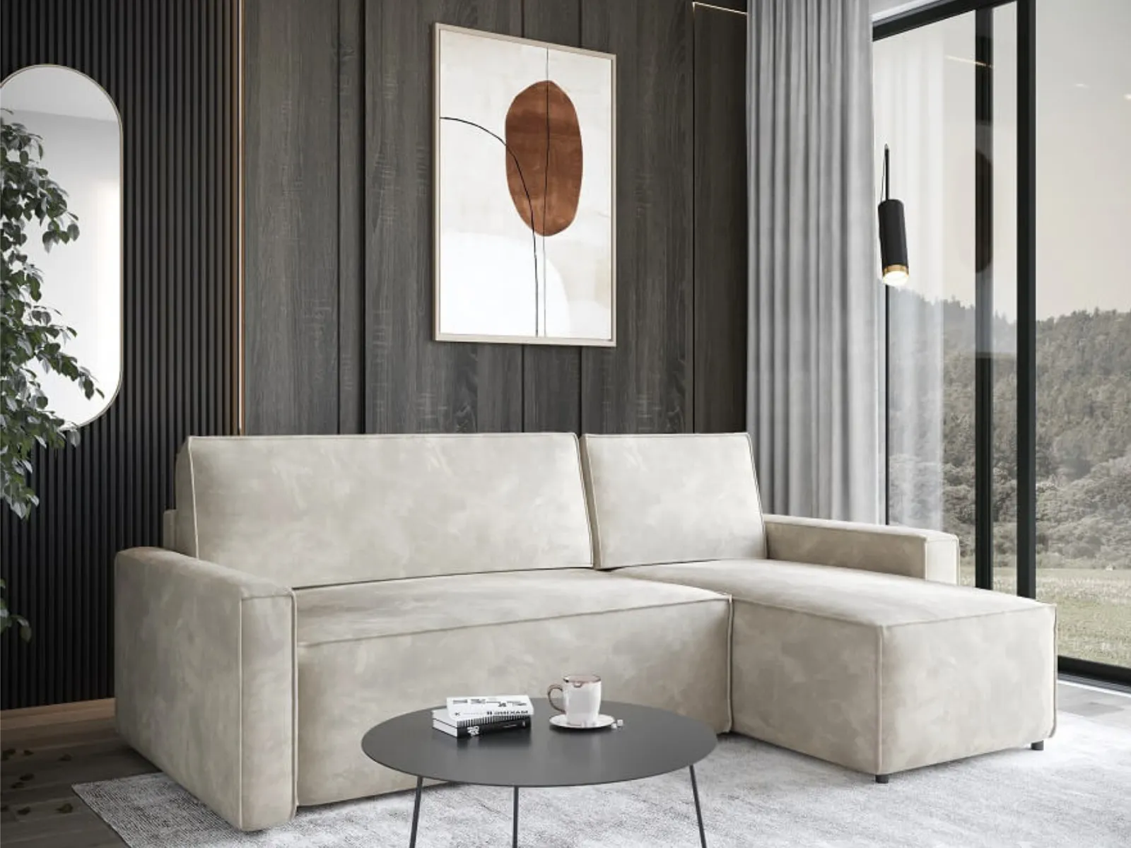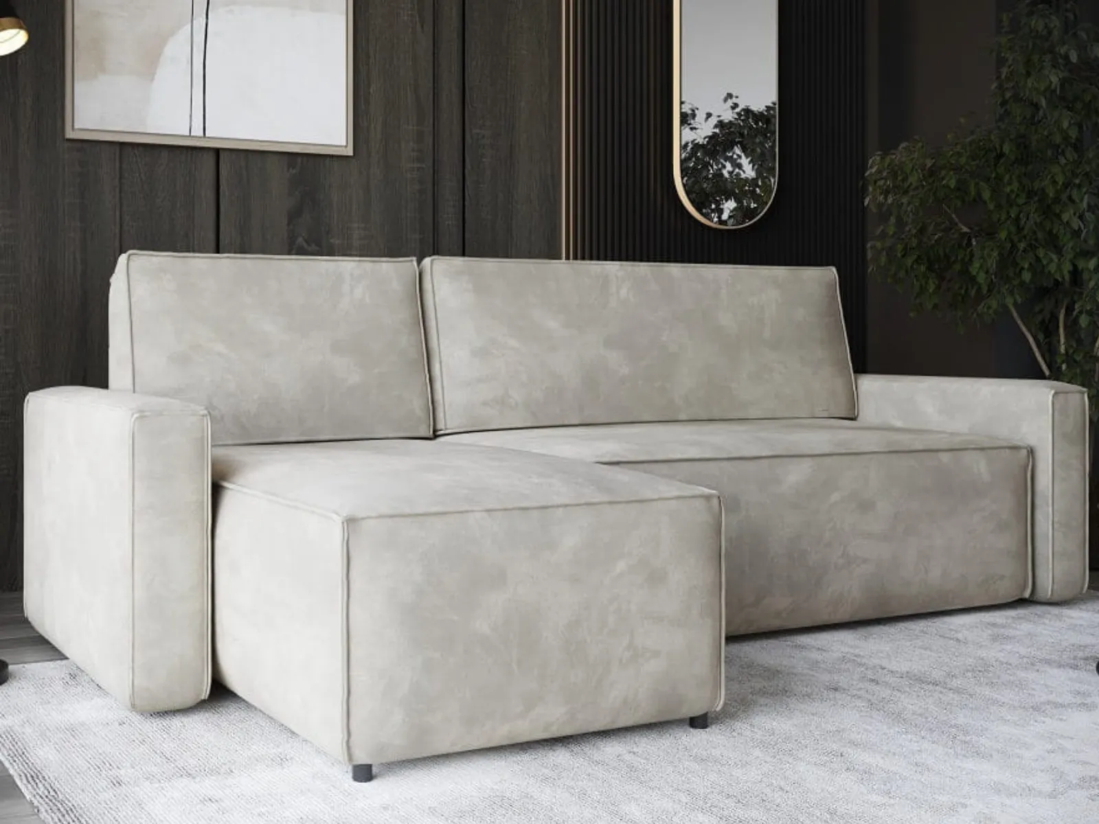 Narożnik L-kształtny 240x150 LERIO z pojemnikiem i funkcją spania - nowoczesna bryła do salonu