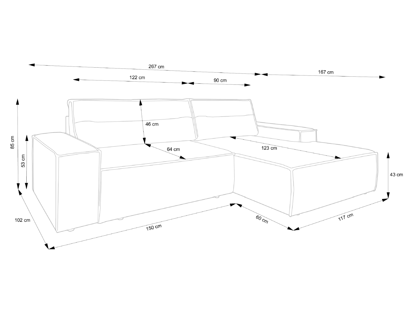 Głębokość siedziska: 64 cm, otomana: 123 cm (z poduchami)
