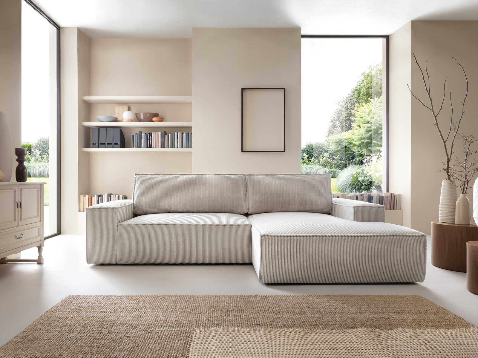 Jego luksusowe wykończenie, beżowy sztruks oraz praktyczne funkcje sprawiają, że stanie się sercem Twojego salonu – miejscem, w którym chce się odpoczywać każdego dnia.