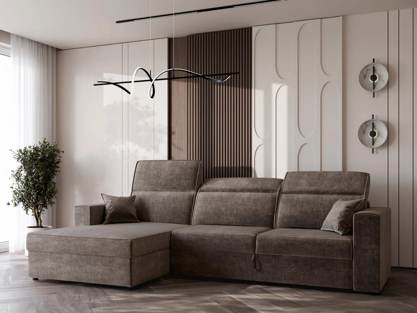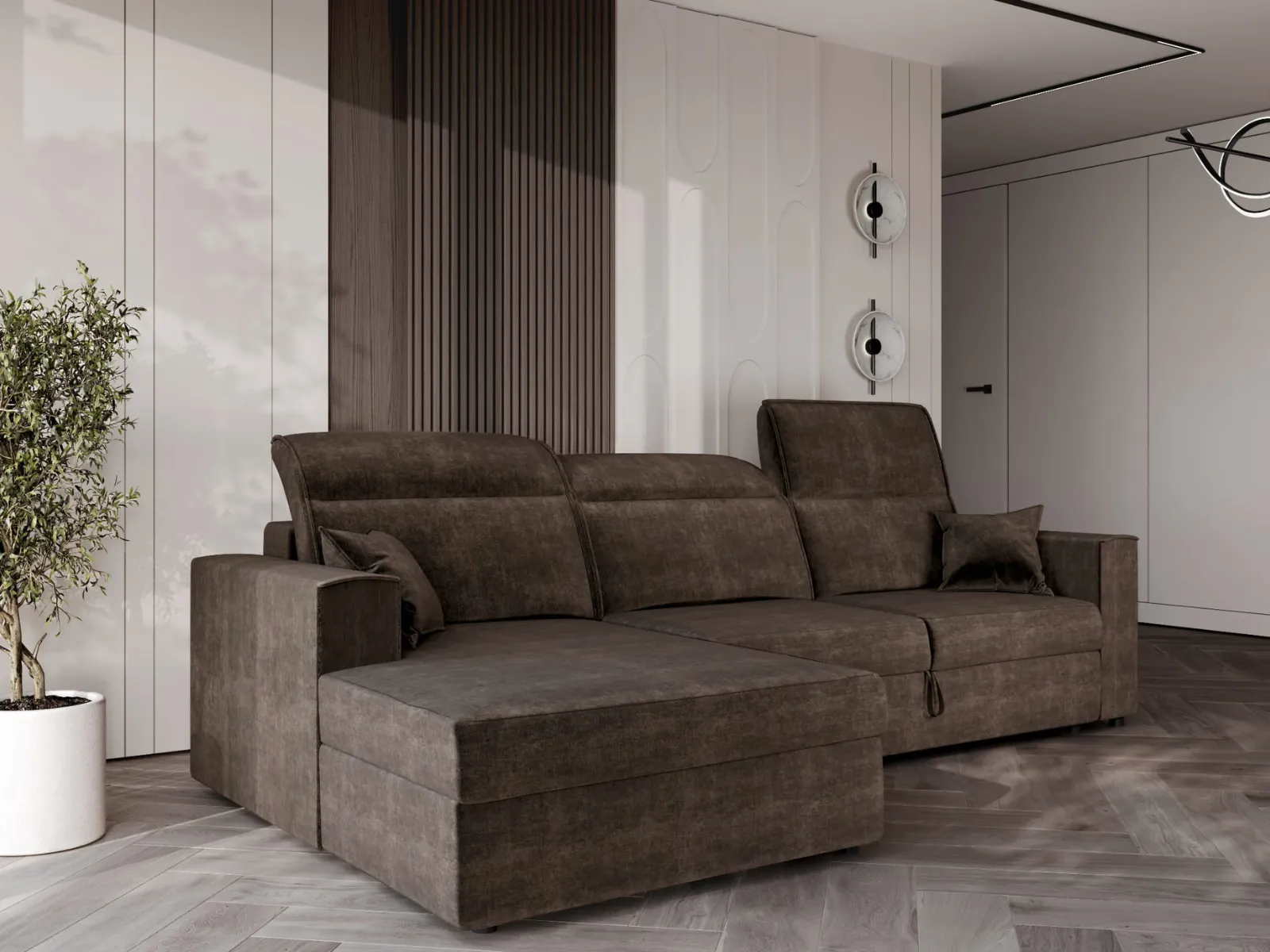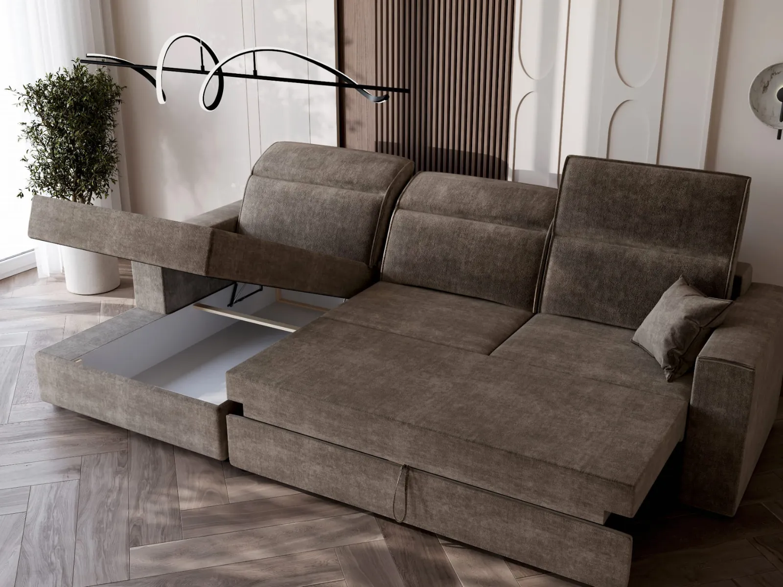 Narożnik L-kształtny 270x170 TOVI z pojemnikiem i funkcją spania brązowy welur