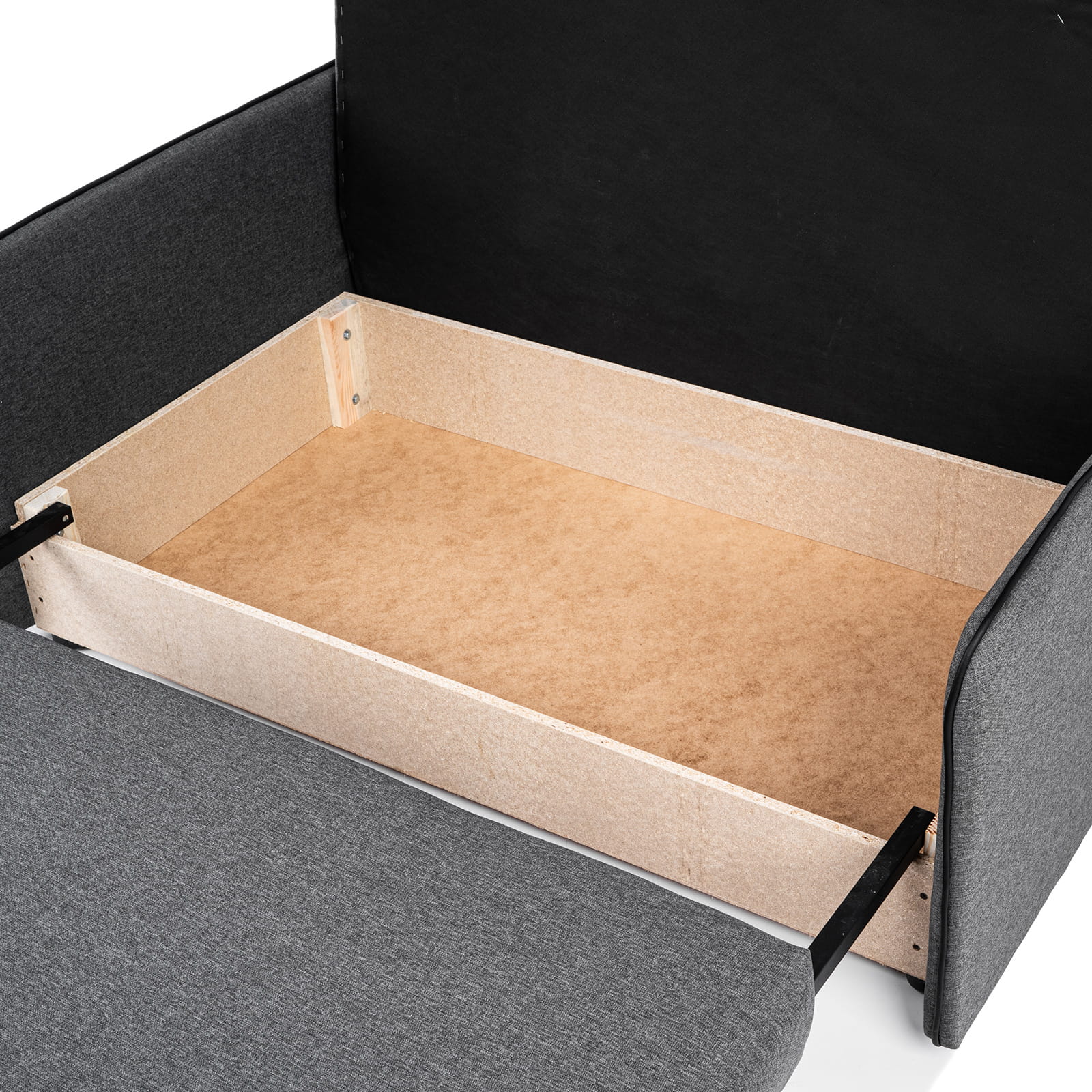 Wbudowany pojemnik na pościel pozwala na łatwe przechowywanie kołdry i poduszek, pomagając w utrzymaniu porządku w salonie czy pokoju gościnnym.