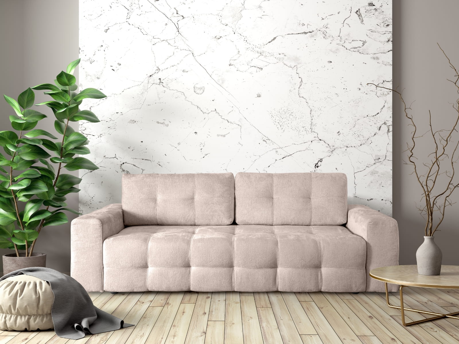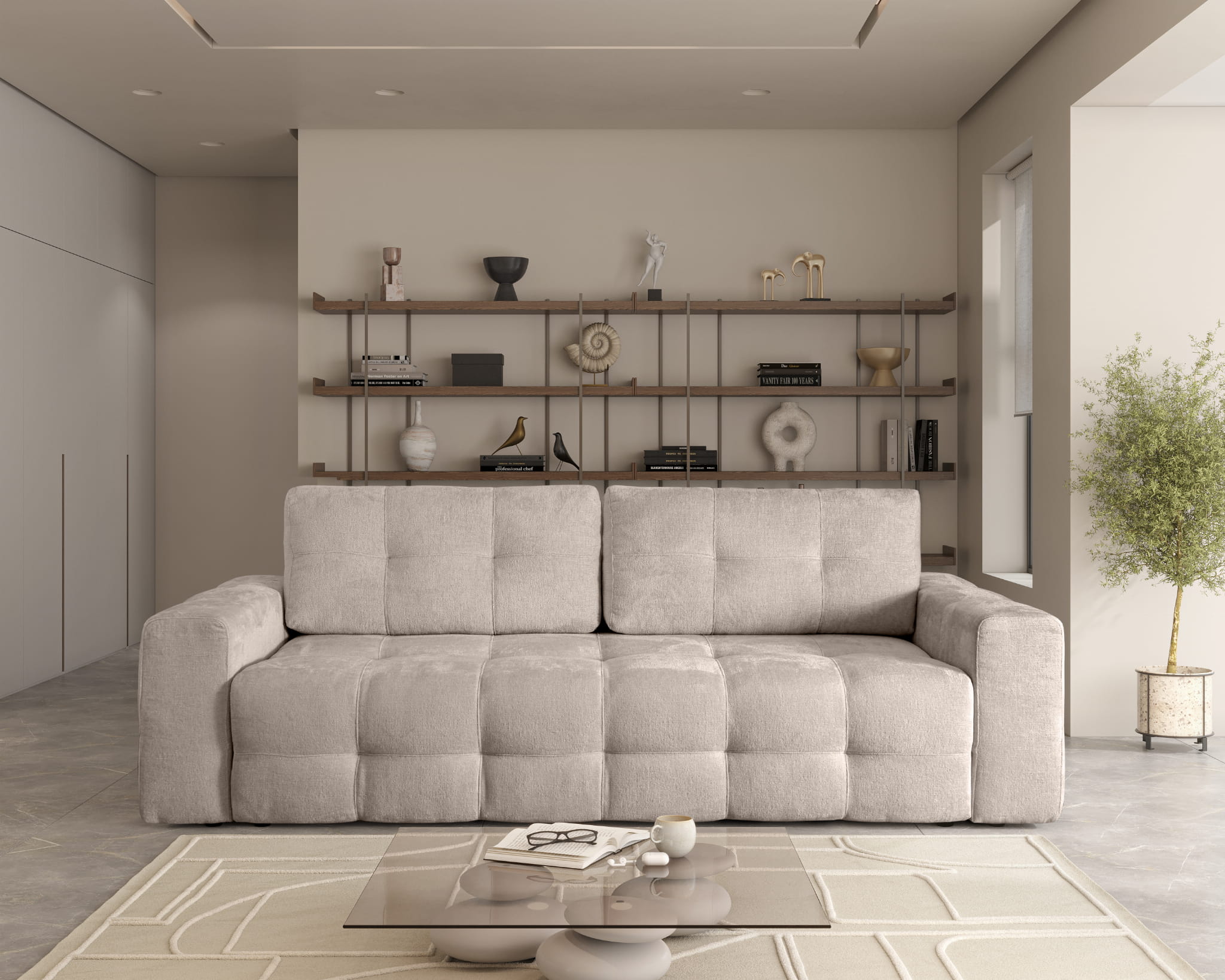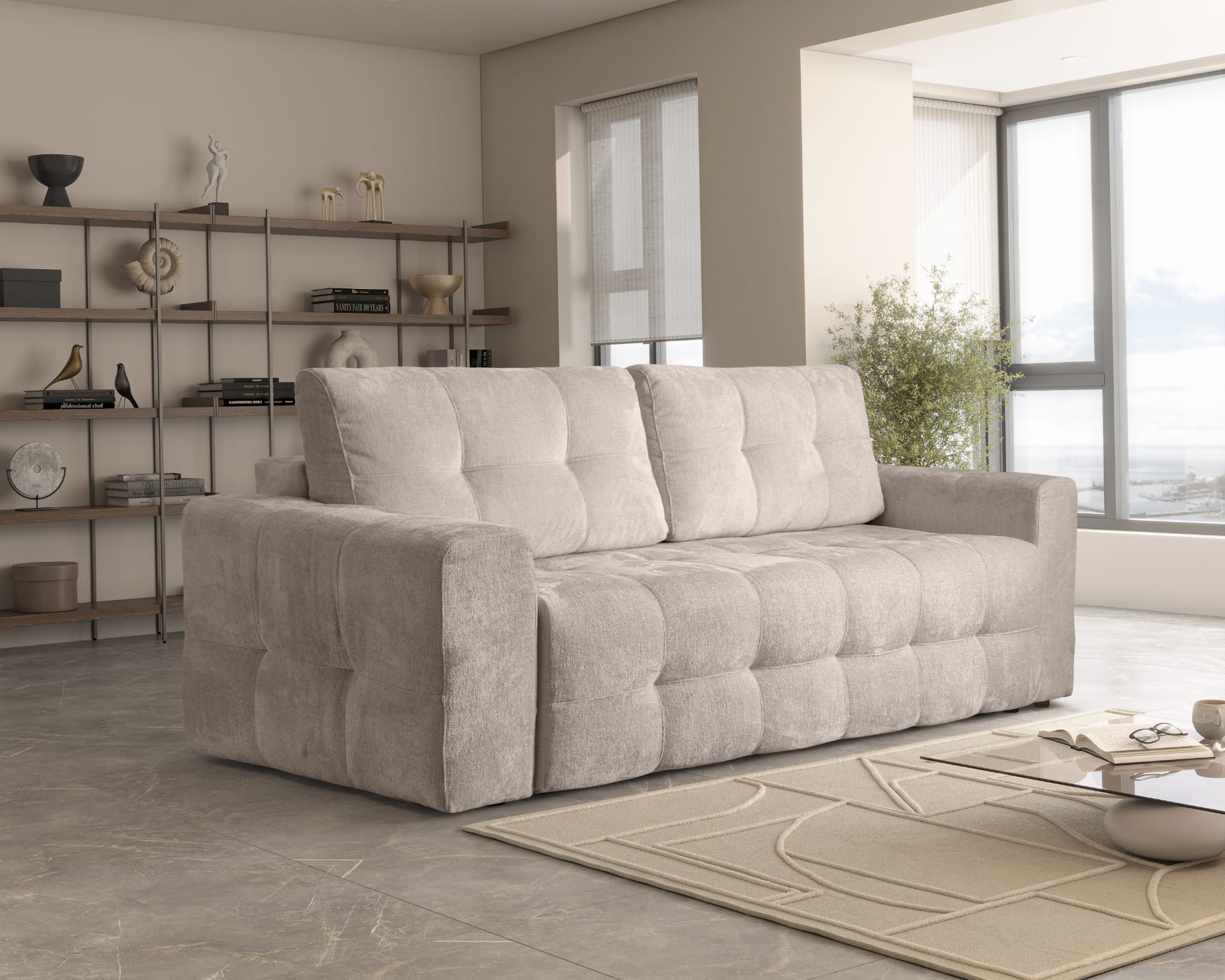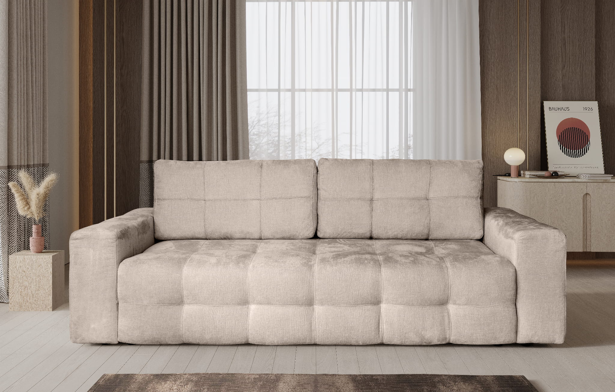Trzyosobowa Sofa 255x108 SILLI rozkładana z funkcją spania oraz pojemnikiem na pościel, beżowy szenil