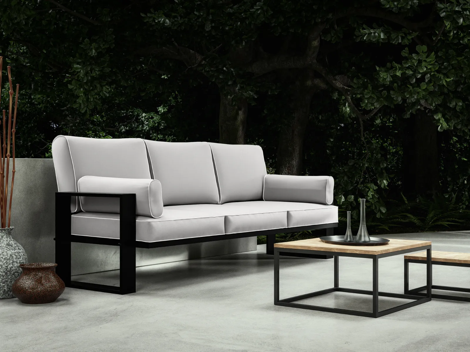 Trzyosobowa sofa ogrodowa 215x87 VERDEO nowoczesna sofa na taras i balkon metalowa czarna konstrukcja z jasnoszarymi poduchami