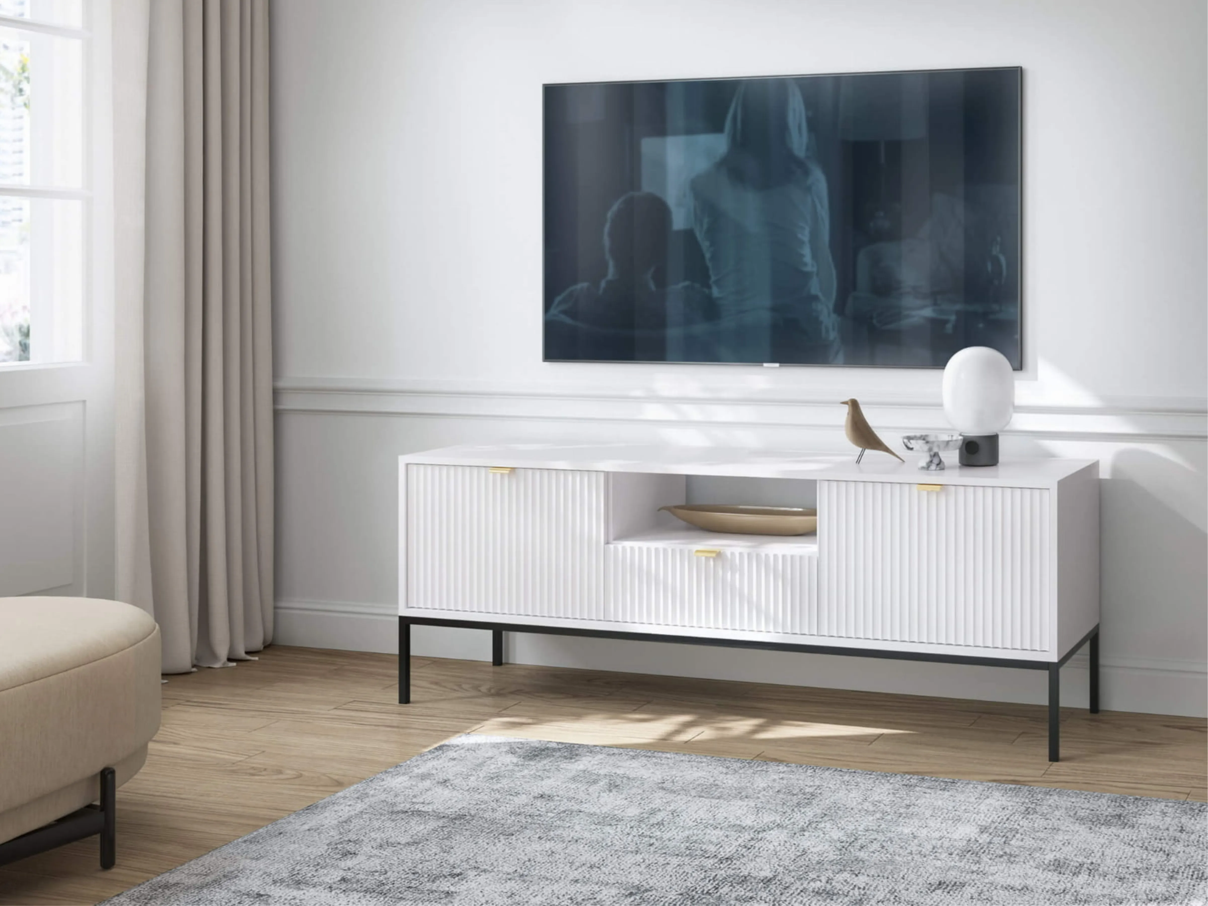 - Szafka RTV 154x56x39 cm BARI RTV154 biała czarne nogi